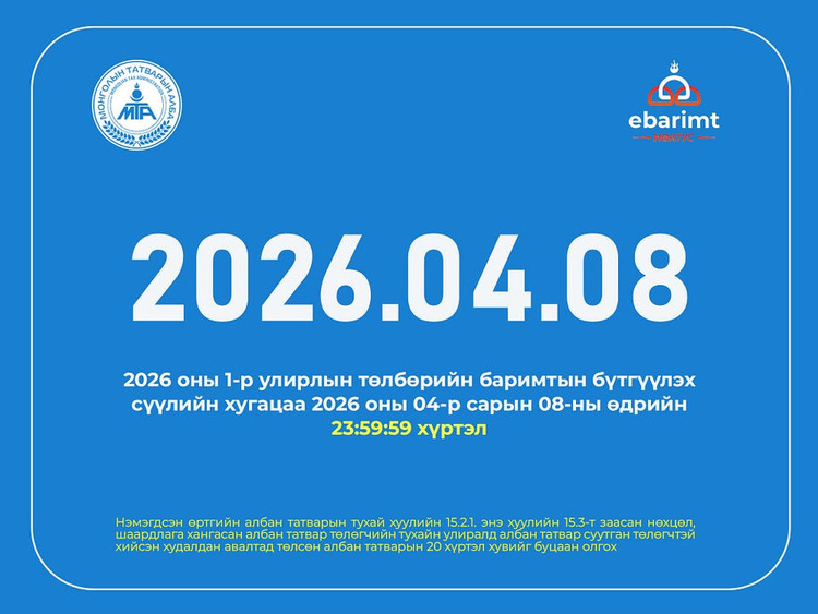 2026 оны 1-р улирлын төлбөрийн баримтаа 2026.04.08-ны 23:59:59 цагаас өмнө амжиж бүртгүүлэн НӨАТ-ын буцаан олголтын урамшууллаа авна уу.