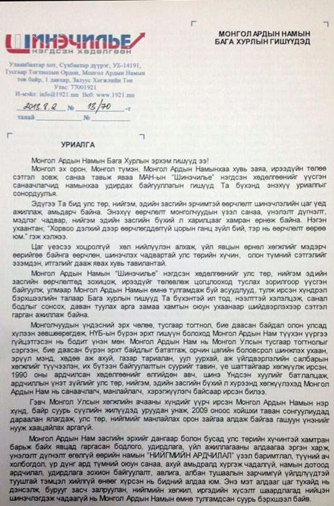 МАН-ын Бага хурлын гишүүдэд хүргэх уриалга
