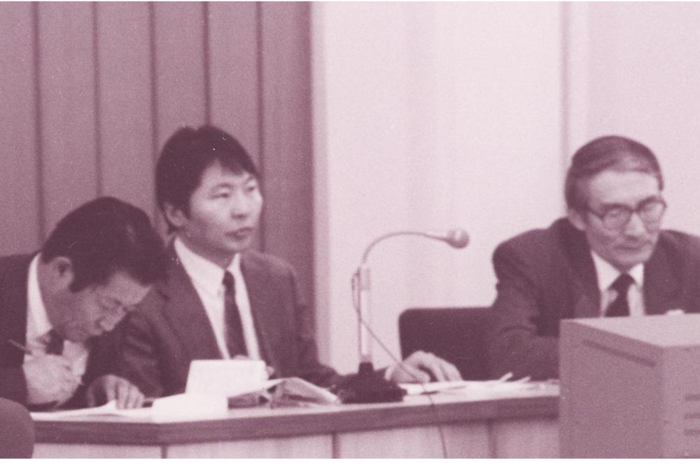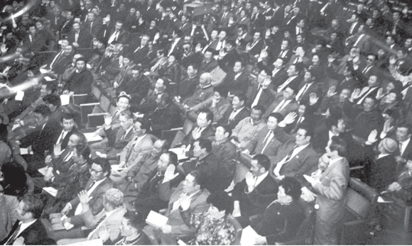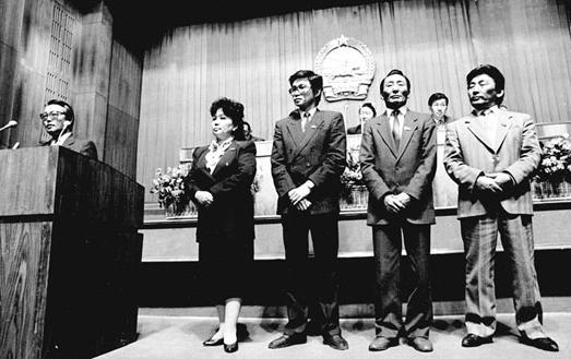 Улсын Бага хурлын дарга Р.Гончигдорж /голд нь/ орлогч дарга К.Зардыхан, Б.Чимэд нар Үндсэн хууль батлах үеэр