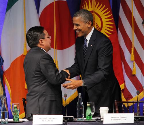 Ерөнхийлөгч Цахиагийн Элбэгдорж НҮБ-ын Ерөнхий Ассамблейн 68 дугаар чуулганд оролцох хөтөлбөрийнхөө хүрээнд “Хөгжиж буй ардчилсан орнууд дахь Иргэний нийгмийн оролцоо” сэдэвтхэлэлцүүлгийг АНУ-ын Ерөнхийлөгч Барак Обама болон НҮБ-ын Ерөнхий нарийн бичгийн даргын орлогч Жан Элиассон нарын хамтаар удирдаж хэлэлцүүлэг өрнүүллээ. Хэлэлцүүлэгт НҮБ дэх Ардчилсан орнуудын бүлгийн /НҮБ-ын Ардчиллын бүлгийн/ улс орны төр, засгийн тэргүүнүүд болонөндөр хэмжээний зочид оролцсон ба Монголын талаас Гадаад харилцааны сайд Л.Болд, Ерөнхийлөгчийн Гадаад бодлого, үндэсний аюулгүй байдлын зөвлөх Л.Пүрэвсүрэн, албаны бусад хүмүүс байлцлаа.