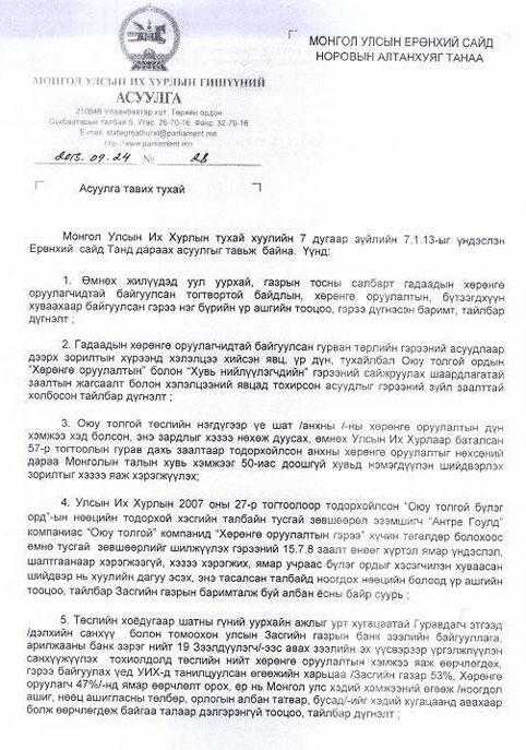 УИХ-ын гишүүн Д.Ганбат Ерөнхий сайд Н.Алтанхуяг хандаж Оюутолгойн ордын талаар асуулга тавьжээ. Уг асуулгад Оюутолгой ордын далд уурхайг ашиглахад хөрөнгө оруулалт хэдий хэмжээгээр нэмэгдэх, монголын талын хүртэх хувь ашиг хэдэн хувь байх зэргийг тодорхой болгохыг хүсчээ. УИХ-ын гишүүний уг асуулгыг доор бүрэн эрхээр нь хүргэе.