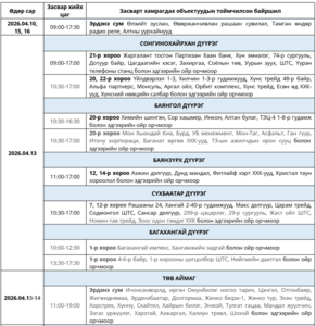 УБЦТС: Өнөөдөр цахилгаан шугам тоноглолд хийгдэх засвар үйлчилгээний хуваарь