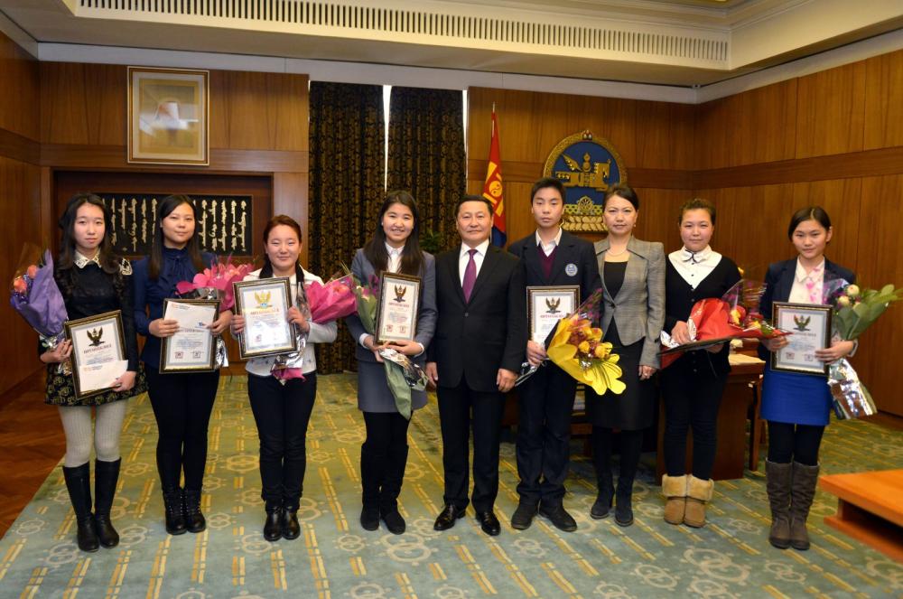 “Ардчилал, шударга ёс-Миний орчинд” сэдвээр ЕБС-ийн сурагчдын дунд зарласан зохион бичлэгийн уралдааны шилдэг оролцогчидтой Ерөнхий сайд Н.Алтанхуяг уулзаж, шагналыг нь гардуулан өглөө.