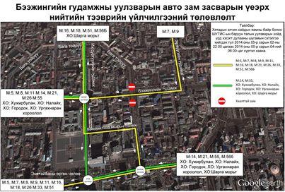 БНХАУ-ын Засгийн газраас Монгол улсын Засгийн газарт олгох буцалтгүй тусламжын хөрөнгөөр “Улаанбаатар хотын Бээжингийн гудамжны өргөтгөл, шинэчлэлийн төсөл”-ийн хүрээнд хийгдэхажлуудтай холбогдуулан тухайн замаар дайран өнгөрөх нийтийн тээврийн үйлчилгээний зарим чиглэлүүдийн замналд дараах өөрчлөлтийг оруулж байна. Үүнд: 1. 2014 оны 05 дугаар сарын 02-ны орой 22:00 цагаас 05 дугаар сарын 04-ний өдрийн 06:00 цаг хүртэл хугацаанд нийтийн тээврийн үйлчилгээний М:5, М:7, М:8, М:9, М:11, М:16, М:18, М:26, М:33, М:51, М:56б, чиглэлүүдийг МУБИС-аас хойш Бага тойруугын замаар яваад Ерөнхий сайд А.Амарын гудамж буюу СТӨ-ний арын замаар явахаар, М:14, М:21, М:55, ХО:Шаргаморьт, ХО:Налайх, ХО:Городок, ХО:Ургахнаран хороолол, ХО:Хужирбулан чиглэлүүдийг Их сургуулийн гудамж буюу Чингисийн талбайн баруун талын замаар явахаар түр хугацааны төлөвлөлтийг хийгээд байна.