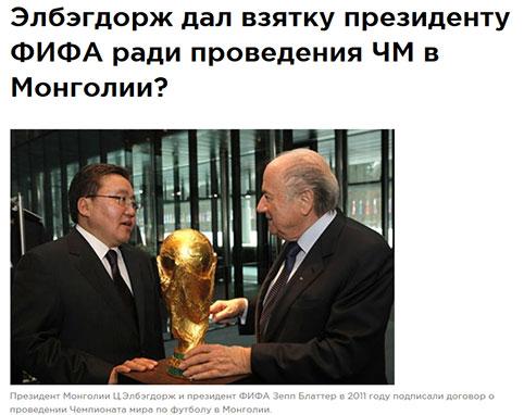 Монгол Улсын ерөнхийлөгч Ц.Элбэгдорж, Олон улсын хөлбөмбөгийн холбоо ФИФА-гийн ерөнхийлөгч Йозеф Блаттер нар Монгол Улсад хөлбөмбөгийн дэлхийн аварга шалгаруулах тэмцээн зохионо хэмээн 2011 онд хэлэлцээрт гарын үсэг зурсан. Британийн хэвлэлүүд үүнийх нь төлөө Монгол Улсын ерөнхийлөгчийг авлига өгсөн байж магадгүй хэмээн хардаж байна.