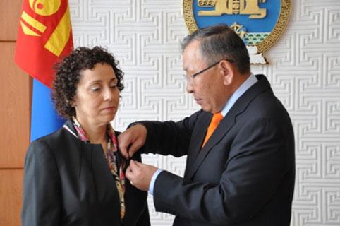 Монгол Улсын Ерөнхийлөгчийн зарлигаар Бүгд Найрамдах Турк Улсын иргэн, НҮБ-ын Хөгжлийн хөтөлбөрийн суурин төлөөлөгч хатагтай Сезин Синаноглуг “Найрамдал” медалиар шагнасныг өнөөдөр Ерөнхийлөгчийн Тамгын газрын дарга П.Цагаан гардуулав.