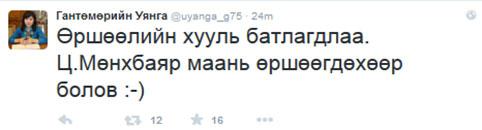 УИХ-ын чуулганы хуралдаан өнөөдөр болж, өршөөлийн хуулийг эцэслэн баталлаа. Багагүй хугацаанд нийгэмд маргаан дагуулаад байсан эл хууль ийн хэрэгжиж эхлэх юм. Хууль батлагдсанаар төрийн ордон руу буу, галт зэвсэг нээсэн хэргээр шүүхээс ял аваад байгаад “Гал-Үндэстэн” холбооны тэргүүн Ц.Мөнхбаяр ч өршөөгдөх боломжтой боллоо. Энэ тухай УИХ-ын гишүүн Г.Уянга “Ц.Мөнхбаяр маань өршөөгдөхөөр боллоо” хэмээн жиргэлээ. Түүний хувьд шүүхээс 7 жилийн аваад байгаа билээ.