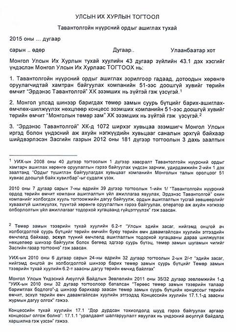 Тавантолгойн нүүрсний ордыг ашиглах тухай УИХ-ын тогтоолын төсөл