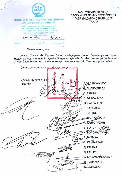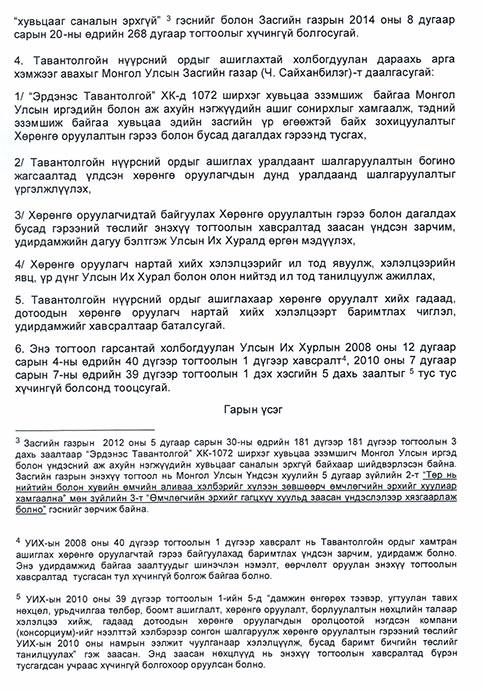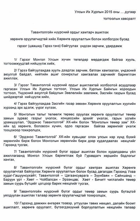 Засгийн газрын боловсруулсан Тавантолгойн хөрөнгө оруулалтын гэрээг нягтлах УИХ-ын гишүүн Л.Эрдэнэчимэгээр ахлуулсан Ажлын хэсэг дүгнэлтээ гаргаад УИХ-ын даргад хүргүүлсэн. Ингээд Ажлын хэсгийнхэн Тавантолгойн нүүрсний ордын цаашдын хөрөнгө оруулалтын гэрээ байгуулахад шаардлагатай хэмээн үзэж УИХ-ын тогтоолын төсөл боловсруулж, Засгийн газраас санал авахаар өнгөрсөн даваа гарагт хүргүүлсэн юм. УИХ-ын 40 гишүүн гарын үсэг зурж, дэмжсэн энэхүү тогтоолын төслийг бүрэн эхээр нь нийтэлж байна.