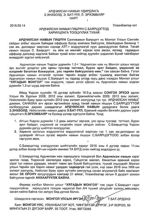 “Хятадын Монгол гэдэг итгэл үнэмшилтэй, өөрийгөө Монгол хүн гэж боддоггүй С.Баярцогт Монгол төрийг удирдаж, иргэдийн татвараар бий болсон төсөв, байгалийн баялгийн хувь заяаг шийдэж байна. Би үүний эсрэг явна...” гэж Т.Бат-Эрдэнэ гэх залуу өнгөрсөн нэгдүгээр сард өөрийн гомдлоо Өргөдлийн байнгын хорооны даргаар ажиллаж байсан О.Баасанхүүд өгсөн билээ. Харин УИХ-ын гишүүн О.Баасанхүү түүний гомдлыг Монгол Улсын прокурор, Төрийн хууль цаазын тэргүүн зөвлөх М.Энх-Амгаланд хүргүүлсэн байдаг. Оффшор бүст байрлуулсан нэг сая ам.долларынхаа эх үүсвэрийг бүрэн тайлбарлаж дуусаагүй, иргэдэд хариуцлага тооцох ганцхан зам байгаа нь сонгууль тул үүнийг ойртуулж, С.Баярцогтын мартагдсан сая ам.долларыг дахин сануулж байгаа гэж Т.Бат-Эрдэнэ хэлж байсан юм. Тэгвэл тэрээр өчигдөр АН-ын дарга З.Энхболд Нийслэлийн АН-ын дарга Э.Бат-Үүл, тус намын Ерөнхий нарийн бичгийн даргын үүрэг гүйцэтгэгч Л.Эрхэмбаяр нарт С.Баярцогтод хариуцлага тооцуулах тухай бичиг хүргүүллээ.