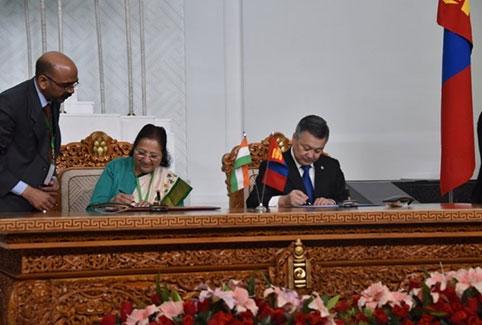 Монгол Улсын Их Хурлын дарга З.Энхболд, БНЭУ-ын парламентын Доод танхим /Лок Сабха/-ын дарга хатагтай Сумитра Махажан нар өнөөдөр /2016.04.19/ Монгол Улсын Их Хурал, БНЭУ-ын парламентын Доод танхим /Лок Сабха/ хоорондын харилцан ойлголцлын санамж бичигт гарын үсэг зурав.