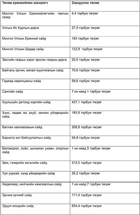 Төсвийн ерөнхийлөн захирагч нараас Сангийн сайд Б.Чойжилсүрэн болон Боловсрол, соёл шинжлэх ухаан, спортын сайд Ж.Батсуурь, Хөдөлмөр, нийгмийн хамгааллын сайд Н.Номтойбаяр бүтэц орон тоо, хамрах цар хүрээнээсээ хамаарч илүү их төсөв зарцуулна. Харин сонирхолтой нь төсөв бүрдүүлэхэд гол үүрэгтэй уул уурхайн салбарын сайд хамгийн бага төсвийг зарцуулна. Уул уурхай, хүнд үйлдвэрийн сайд Ц.Дашдоржоос ч багыг Ерөнхийлөгчийн тамгын газарт хуваарилсан байна. Энэ нь ирэх онд гадаад томилолтын зардлыг хассантай холбоотой. Ингээд 2017 онд аль салбарын сайд хэдэн төгрөг зарлагадахыг дараахь хүснэгтээс харна уу.