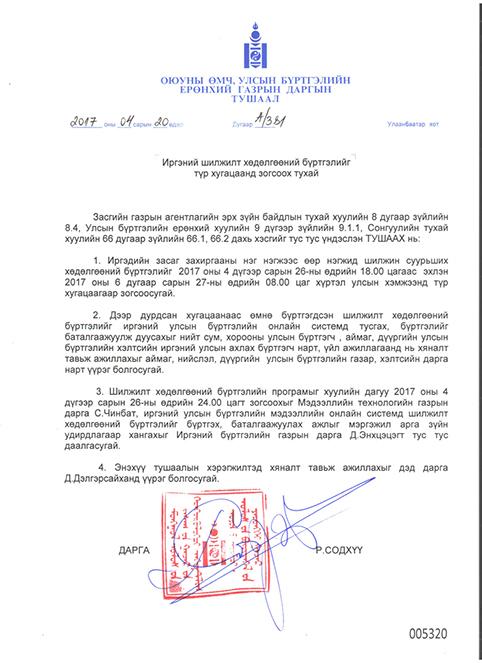 Монгол Улсын Ерөнхийлөгчийн сонгууль ирэх зургаадугаар сарын 26-ны өдөр болно. Үүнтэй холбогдуулан хуульд заасны дагуу шилжилт хөдөлгөөнийг зогсооно. Энэ тухай Оюуны өмч, улсын бүртгэлийн ерөнхий газрын дарга Р.Содхүү тушаал гаргажээ. Тушаал ёсоор энэ сарын 26-ны 18.00 цагаас эхлэн зургаадугаар сарын 27-ны өдрийн 08.00 цаг хүртэл улсын хэмжээнд шилжилт хөдөлгөөнийг түр зогсоох юм байна.