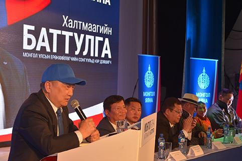 Тэрбээр “Намайг үргэлж дэмжиж байсан өвөрхангайчууддаа баярлаж явдаг шүү. Гурван нэр дэвшигчийг гурвууланг нь сайн, Ерөнхийлөгч болж чадна гэж намууд нь итгэл хүлээлгэсэн байх. Энэ дундаас өнгөрсөн нэг жилийн хугацаанд болсон алдаа завхралыг засаад явж чадах хүн бол Халтмаагийн Баттулга. Яагаад вэ гэдгийг хэдэн жишээгээр тайлбарлая. Яг жилийн өмнө зургадугаар сард УИХ-ын сонгууль болсон, АН ялагдсан. АН алдаа дутагдалдаа дүгнэлт хийгээд, гишүүдээрээ асуудлаа шийдүүлдэг болж, Баттулга нэр дэвшигчийг хүртэл нийт гишүүдээсээ сонгосон. Нөгөө хоёр нэр дэвшигчийг бол цөөн хэдхэн дарга нараараа шийддэг хуучин аргаар тодруулсан юм билээ. Бид УИХ-ын сонгуульд яагаад ялагдчихав гээд дүгнэлт хийгээд явж байтал саяхан тодорхой болсон.