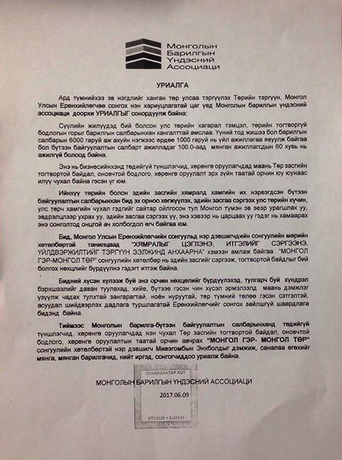 Монголын барилгын үндэсний ассоциаци Миеэгомбын Энхболдыг дэмжихийг уриаллаа