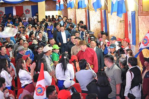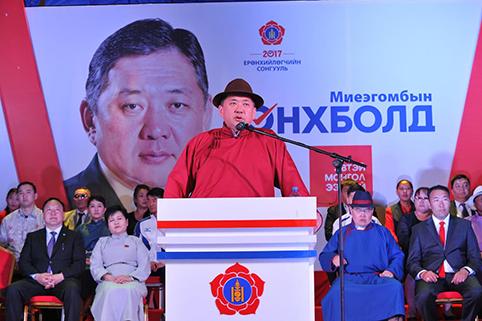 Монгол Улсын Ерөнхийлөгчийн сонгуульд МАН-наас нэр дэвшигч Миеэгомбын Энхболдын хонгор нутгийн түмэнтэй хийсэн уулзалт 10.00 цагт аймгийн Хөгжимт драмын театрт эхэлсэн юм. Хөгжимт драмын театрын заал дүүрэн үзэгч цугларсан байлаа. Харин зааланд орж чадаагүй дэмжигч, сонгогчид аймгийн Соёмбот талбайд цугларсан байсан юм.