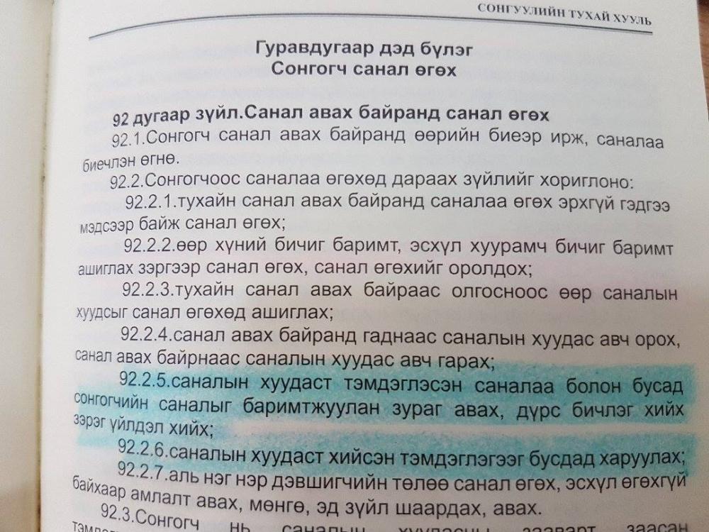 Монгол Улсын Ерөнхийлөгчийн сонгуулийн санал хураалт өнөөдөр өглөө 07:00 цагт орон даяар эхэлсэн. Гэвч Сонгуулийн тухай хуулийн талаар мэдээлэл муутай байгаа иргэд саналаа баталгаажуулах гэж фэйсбүүк хуудсаараа дамжуулан хэнд саналаа өгсөн талаарх зургаа ихээр нийтлэх болов. Энэ нь Сонгуулийн тухай хуулийн Гуравдугаар дэд бүлэг буюу Сонгогч санал өгөх 92 дугаар зүйлийн 2.5-д заасан саналын хуудаст тэмдэглэсэн саналаа болон бусад сонгогчийн саналыг баримтжуулан зураг авах, дүрс бичлэг хийх зэрэг үйлдэл хийх, 2.6-д заасан саналын хуудаст хийсэн тэмдэглэгээг бусдад харуулах гэсэн заалтуудыг зөрчиж буй юм. Тус хуулиар бол дээрх зүйл, заалтуудыг зөрчсөн иргэн, холбогдох бусад этгээдэд эрүүгийн хариуцлага хүлээлгэхээргүй бол 14 хоногийн хугацаагаар баривчлах захиргааны шийтгэл ногдуулдаг.