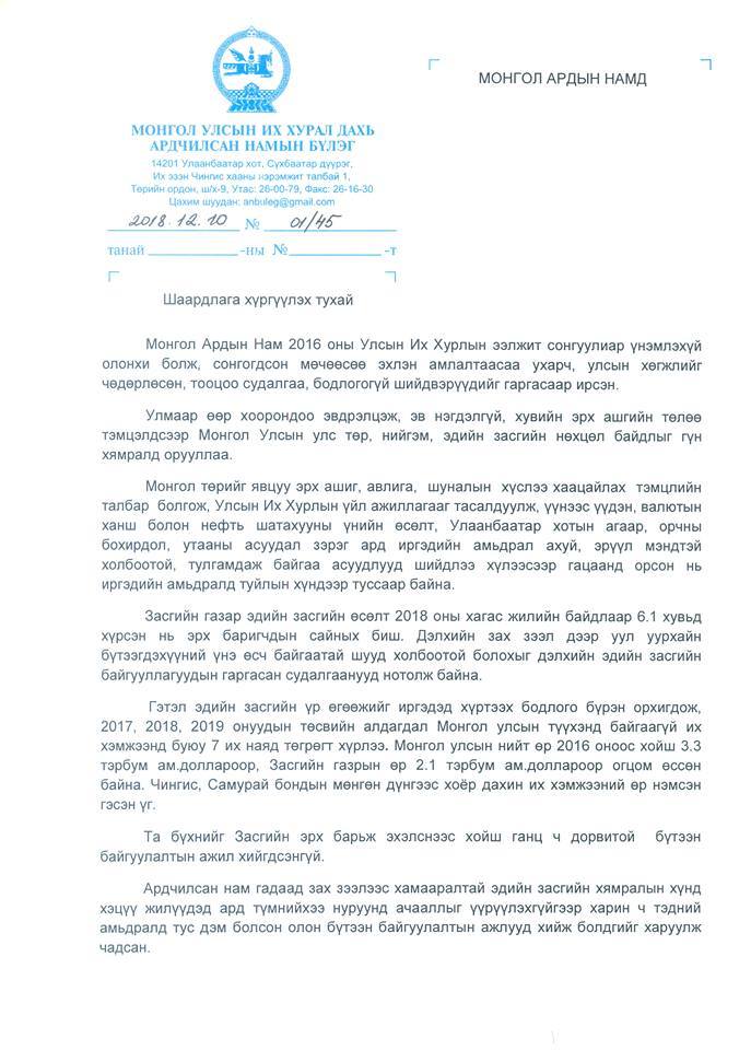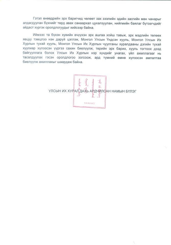 Иймээс та бүхэн хувийн өчүүхэн эрх ашгаа хойш тавьж, эрх мэдлийн төлөөх явцуу тэмцлээ нэн даруй цэглэж, Монгол Улсын Үндсэн хууль, Монгол Улсын Их Хурлын тухай хууль, Монгол Улсын Их Хурлын чуулганы хуралдааны дэгийн тухай хуулиар хүлээсэн үүргээ сахин биелүүлж, төрийн эрх барих, хууль тогтоох дээд байгууллага болох Улсын Их Хурлын нэр хүндийг унагах, үйл ажиллагааг нь тасалдуулах гэсэн оролдлогоо зогсоож, ард түмний өмнө хүлээсэн амлалтаа биелүүлж ажиллахыг шаардаж байна" гэжээ.