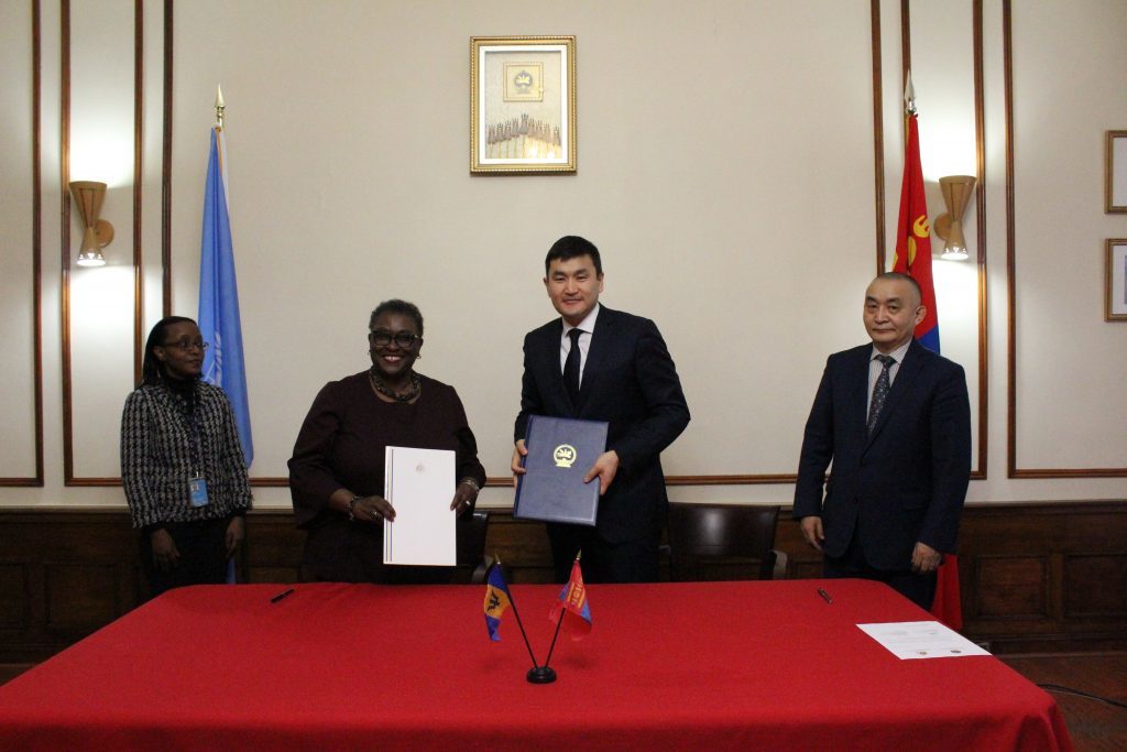 НҮБ-ын гишүүн бүх улстай Монгол Улс дипломат харилцаа тогтоох зорилтын хүрээнд Монгол Улс Барбадос Улстай 2019 оны 1 дүгээр сарын 17-нд Нью-Йорк хотноо дипломат харилцаа тогтоожээ. Хоёр улс найрсаг харилцаа, хамтын ажиллагааг хөгжүүлэн бэхжүүлэх хоёр талын эрмэлзлийг удирдлага болгож, Дипломат харилцааны тухай Венийн конвенц, НҮБ-ын Дүрэм, олон улсын эрх зүйн зарчим, хэм хэмжээг баримтлахаа тохиролцсон байна. Дипломат харилцаа тогтоох тухай Хамтарсан албан мэдээнд Монгол Улсаас НҮБ-ын дэргэд суугаа Онц бөгөөд Бүрэн эрхт Элчин сайд, Байнгын төлөөлөгч С.Сүхболд, Барбадос Улсаас НҮБ-ын дэргэд суугаа Онц бөгөөд Бүрэн эрхт Элчин сайд, Байнгын төлөөлөгч Х. Елизабет Томпсон нар гарын үсэг зурав. Дипломат харилцаа тогтоосноор хоёр талын болон олон улсын байгууллагуудын хүрээнд харилцан дэмжлэг үзүүлэх, хамтран ажиллах илүү боломж нээгдэж байгааг талууд тэмдэглэжээ.