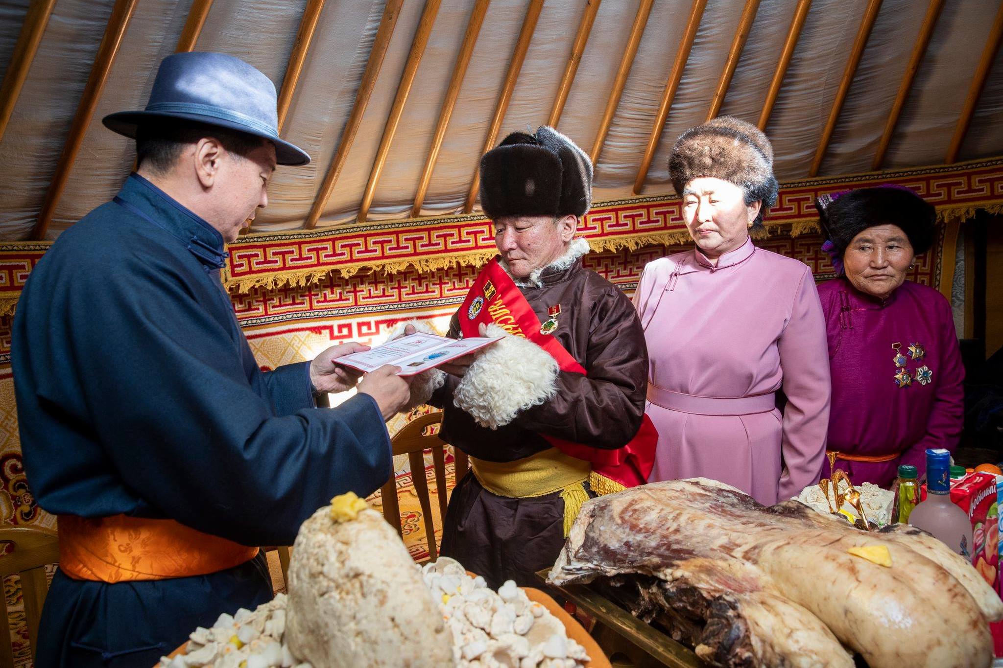 Монгол Улсын Ерөнхий сайд У.Хүрэлсүх Сүхбаатар аймгийн Сүхбаатар сумын дөрөвдүгээр багийн малчин Шагдарын Өвгөнхүүд Улсын аварга малчин цол тэмдгийг нь гардуулж өглөө.