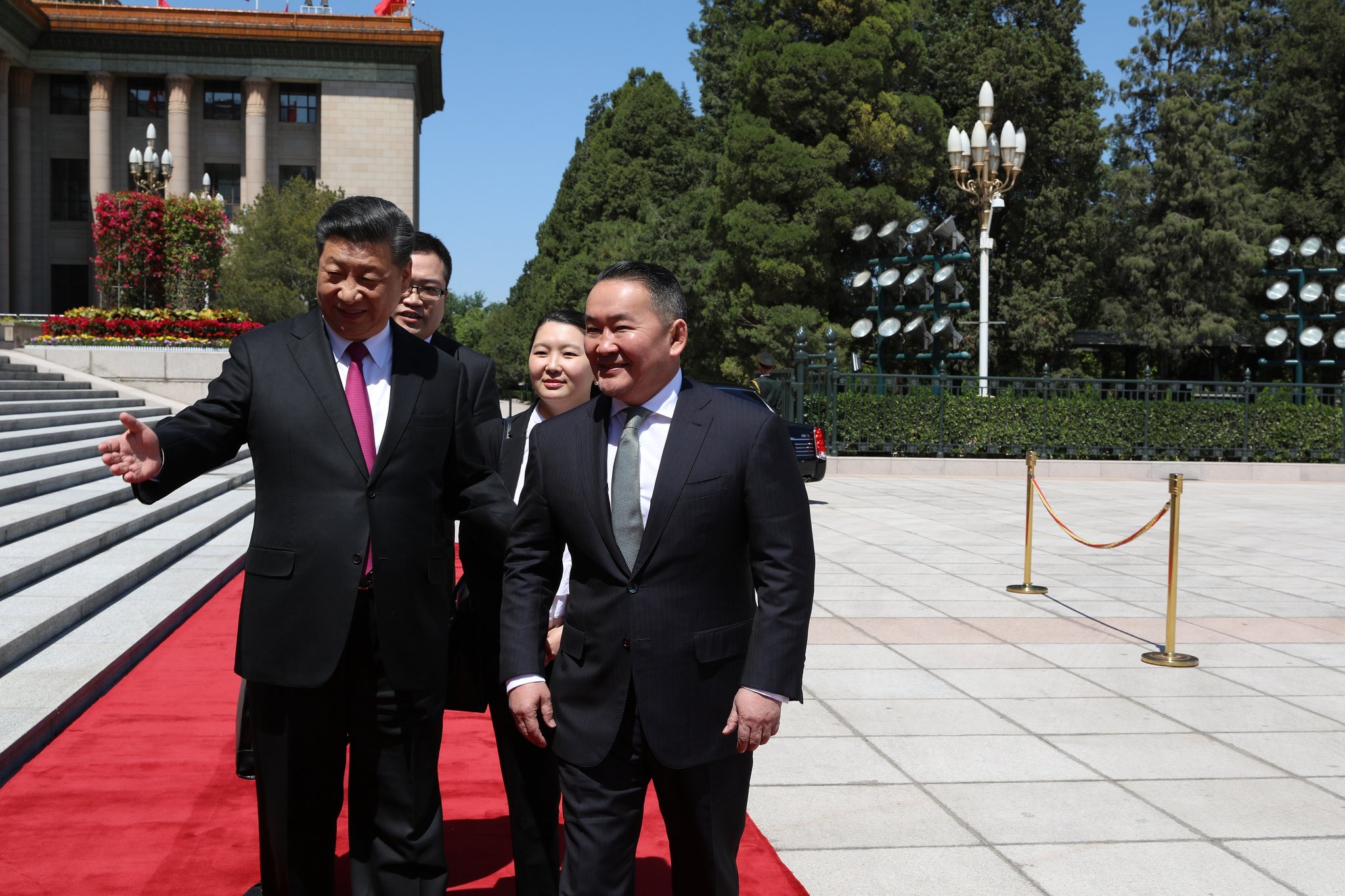 Мөн хоёр улсын Төрийн дуулал эгшиглэж, хүндэт харуул жагссанаар Монгол Улсын Ерөнхийлөгч Х.Баттулга, БНХАУ-ын дарга Ши Жиньпин нар албан ёсны хэлэлцээ хийхээр Ардын Их Хурлын ордныг зорилоо.