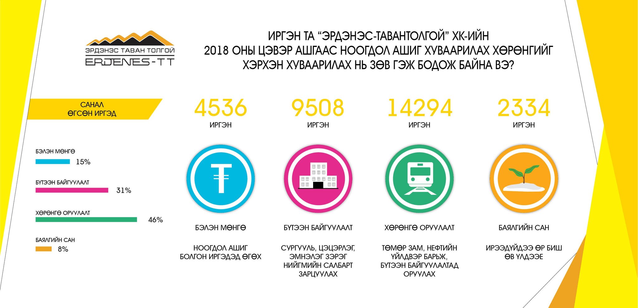 Иймд иргэдийн саналд тулгуурласан бодитой хариултыг авахаар "Эрдэнэс-Тавантолгой” ХК-иас 2019 оны 2 дугаар сараас "Иргэн та "Эрдэнэс-Тавантолгой" ХК-ийн 2018 оны цэвэр ашгаас ноогдол ашиг хуваарилах хөрөнгийг хэрхэн зарцуулах нь зөв гэж бодож байна вэ” санал асуулгыг "erdenestt.mn” сайтаар явуулж байна.