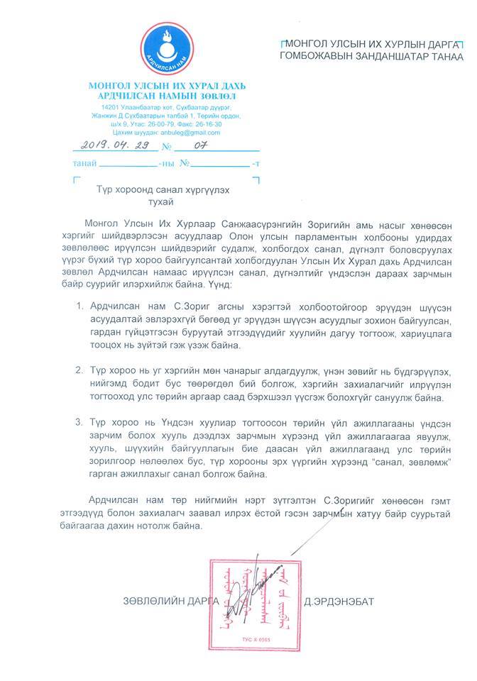Өнгөрсөн долоо хоногт Монгол Улсын Их Хурлаар С.Зоригийн хэргийг шийдвэрлэсэн асуудлаар Олон улсын парламентын холбооны удирдах зөвлөлөөс ирүүлсэн шийдвэрийг судалж, холбогдох санал, дүгнэлт боловсруулах үүрэг бүхий түр хороо байгуулсан. Тэгвэл АН-ын Зөвлөл бүлгийн хуралдаанаар энэ хэрэгт хамаарах санал дүгнэлтийг түр хороонд хүргүүлэх нь зүйтэй хэмээн хэлэлцсэн учир Монгол Улсын Их хурлын дарга Г.Занданшатарт албан тоот хүргүүлжээ. Тус санал хүргүүлэх тухай бичигтээ Ардчилсан нам С.Зоригийг хөнөөсөн гэмт этгээдүүд болон захиалагч заавал илрэх ёстой гэсэн зарчмын хатуу байр суурьтай байгаагаа илэрхийлсэн байна.