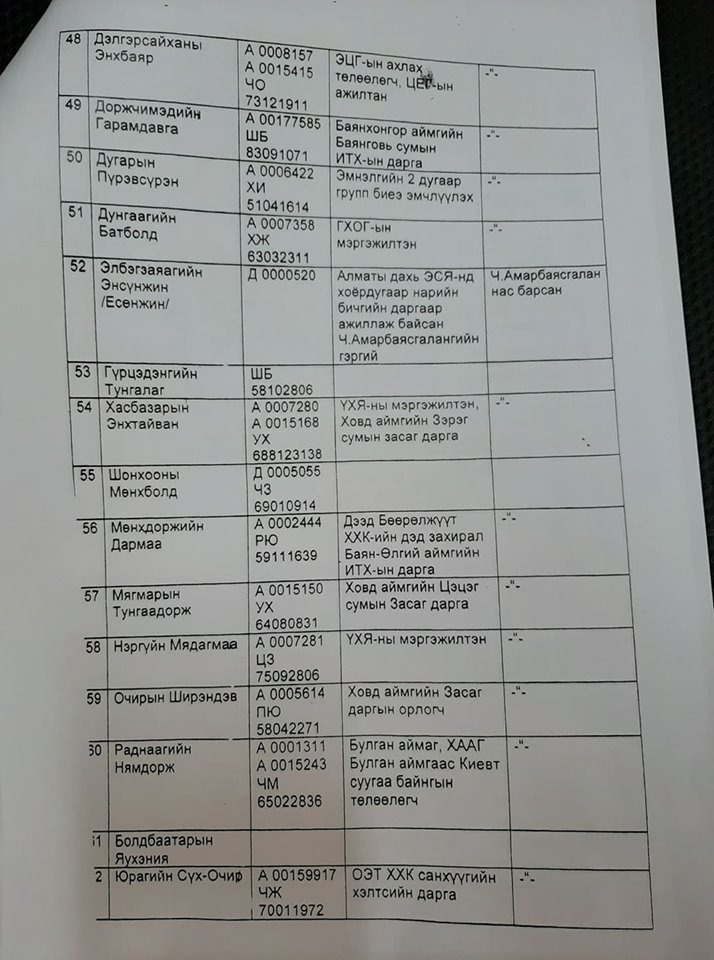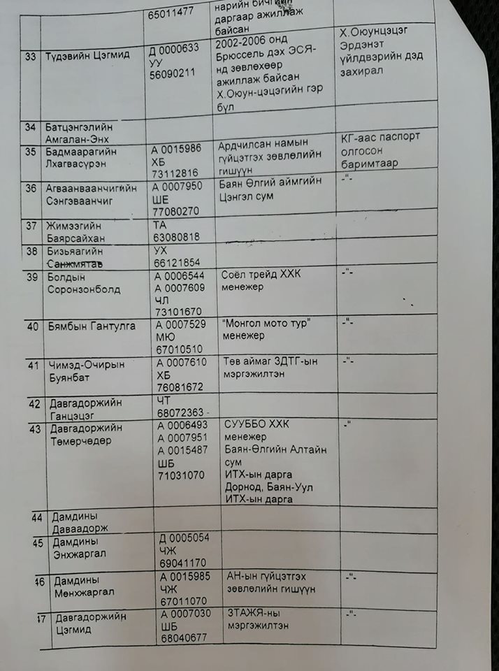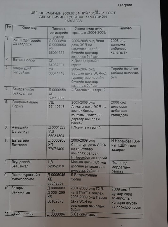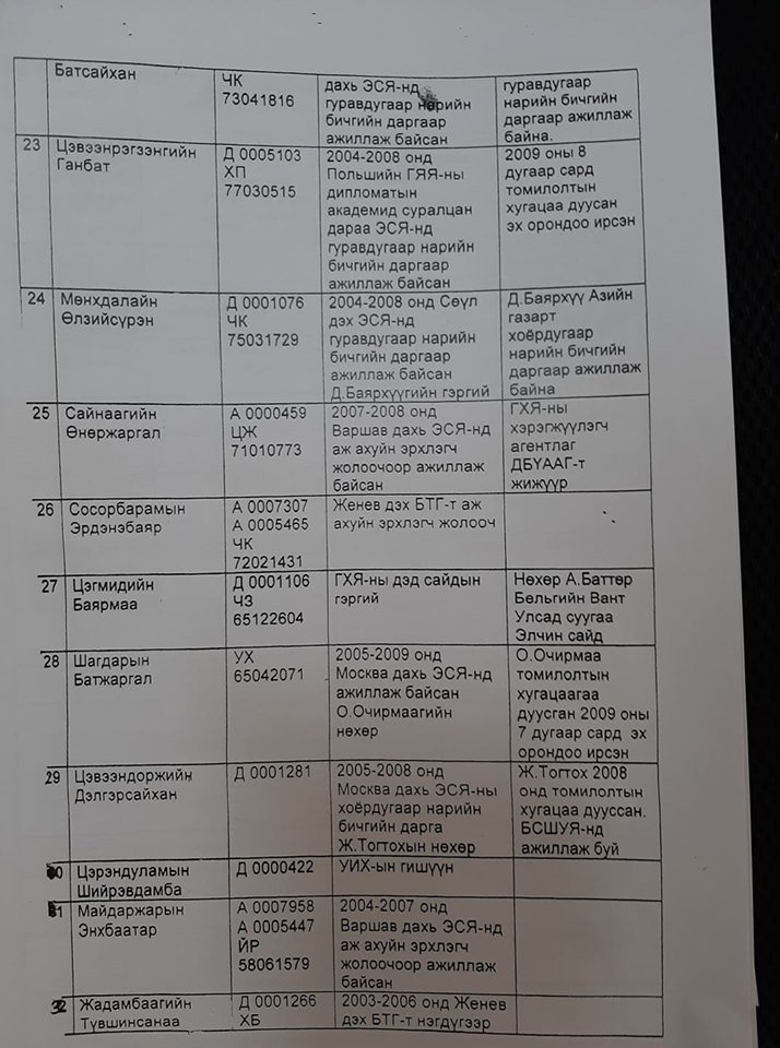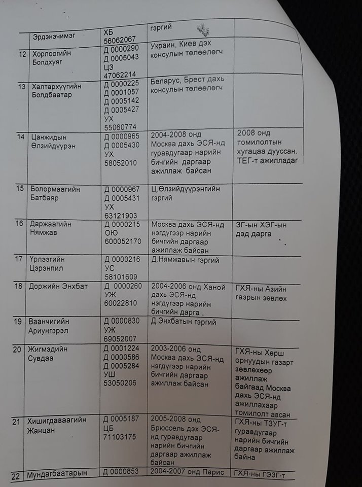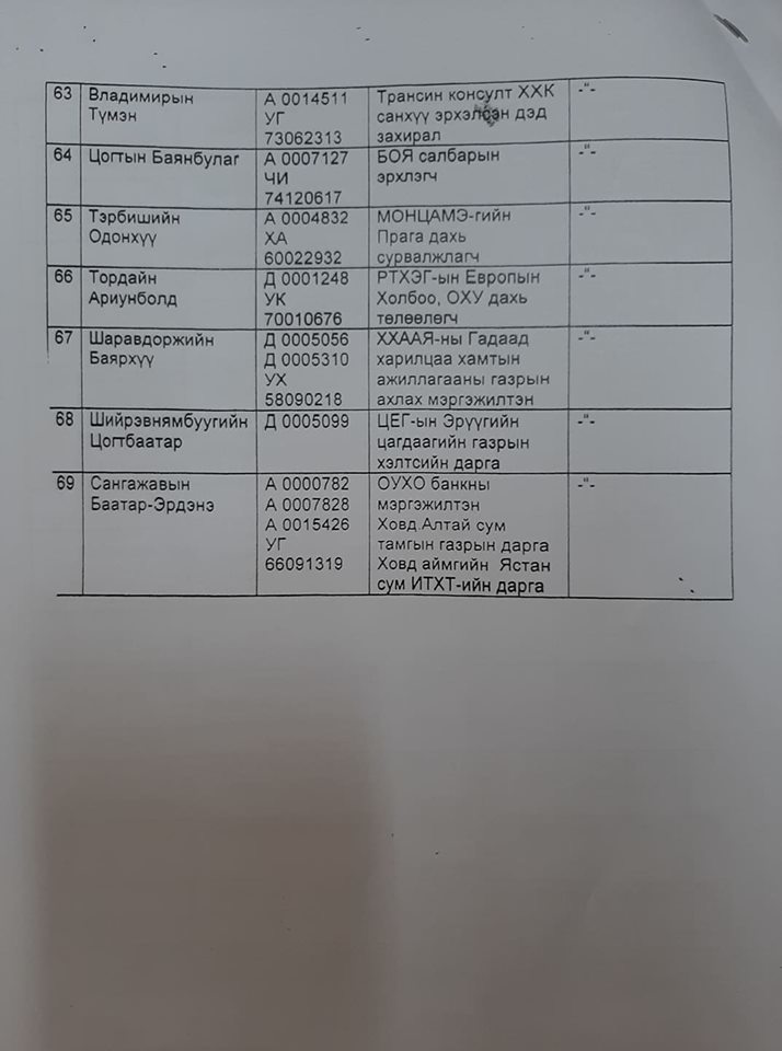 Гадаадад гэмт хэрэгт холбогдсон 69 хүний мэдээллийг ГХЯ-наас тус байнгын хороонд ирүүлжээ. Үүнд гадаад улс орнуудад байгаа дипломат төлөөлөгчийн газарт ажиллаж байхдаа гэмт хэрэгт холбогдсон хүмүүсийн мэдээлэл байгаа юм. Мөн төрийн албаны, улс төрийн намуудын удирдах түвшний, дипломат болон албан паспорттой хүмүүсийн мэдээлэл багтсан гэдгийг байнгын хорооны дарга Т.Аюурсайхан мэдээллийнхээ эхэнд онцлов.