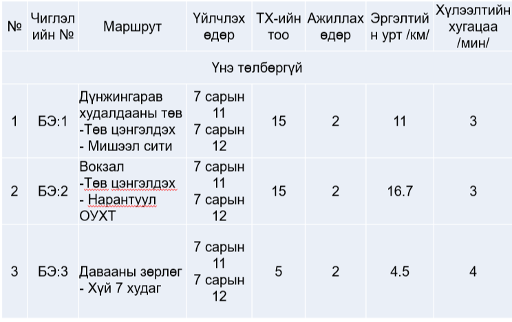 Тулгар төрийн 2230, 2231, Их Монгол Улсын 815, 816 жил, Ардын хувьсгалын 100, 101 жилийн ой, Үндэсний их баяр наадмын өдрүүдэд нийтийн тээврийн үйлчилгээнд үндсэн /хотын доторх болон хот орчмын/ 107 чиглэлд их, дунд багтаамжийн 674, зуслангийн гурван чиглэлд тав, шөнийн тээврийн үйлчилгээний гурван чиглэлд зургаа, нийт 685 автобус үйлчилгээнд ажиллуулахаар Нийслэлийн Нийтийн тээврийн газраас төлөвлөөд байна.