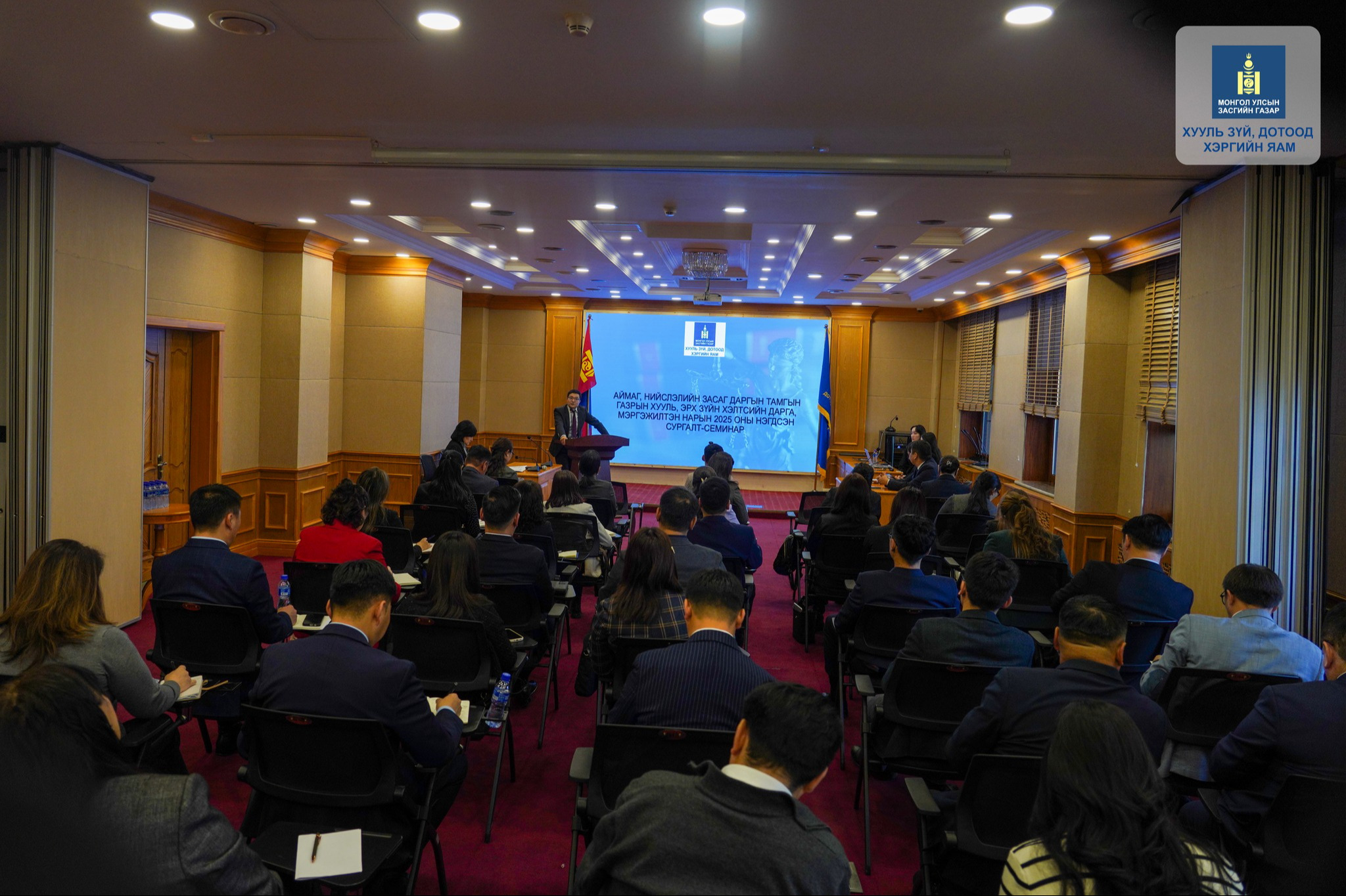 Хууль зүй дотоод хэргийн яам аймаг, нийслэл, дүүргийн Засаг даргын Тамгын газрын Хууль, эрх зүйн хэлтсийн дарга, мэргэжилтнүүдэд зориулсан сургалтыг 2025 оны 11 дүгээр сарын 13-14-ний өдрүүдэд зохион байгуулж байна.