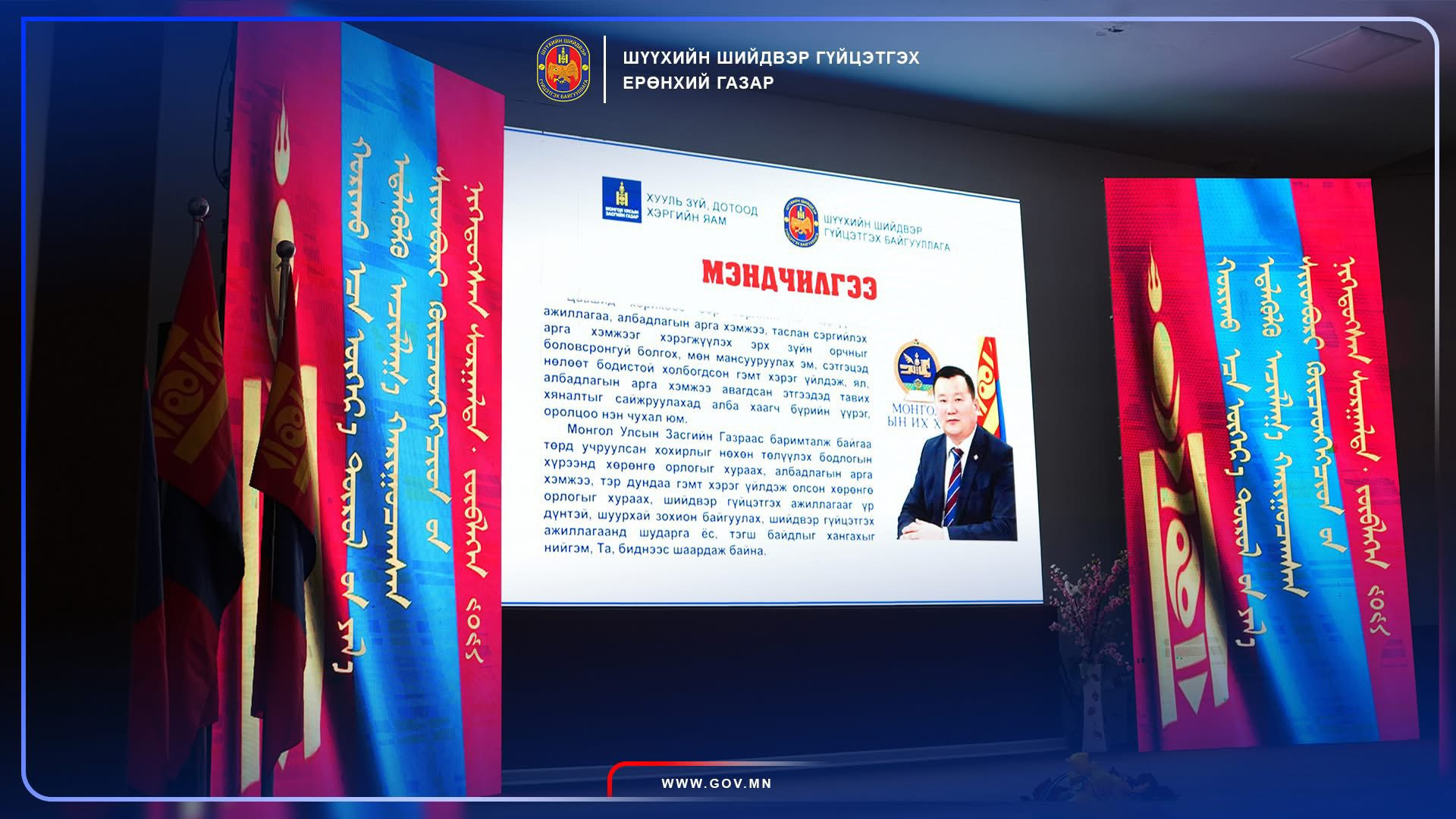 Энэ үеэр нэгдсэн сургалт, зөвлөгөөнд оролцогчдод Монгол Улсын Их Хурал, Засгийн Газрын гишүүн, Хууль зүй, дотоод хэргийн сайд Л.Мөнхбаатарын мэндчилгээг уламжиллаа.