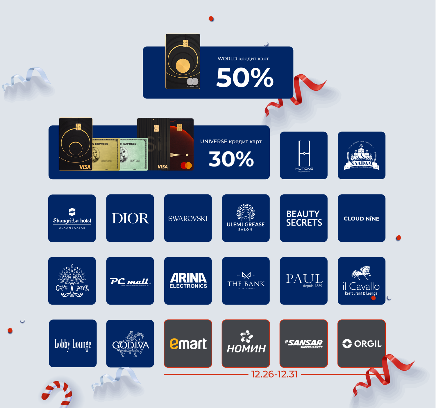 Урамшуулалт хөтөлбөрийн хүрээнд та Голомт банктай хамтран ажилладаг томоохон байгууллагуудаас Голомт банкны бүх төрлийн кредит карт болон шинээр захиалсан Universe дебит картаа ашиглан худалдан авалт хийгээд үнийн дүнгийн 30%, 50%-ийг буцаан авах боломжтой.