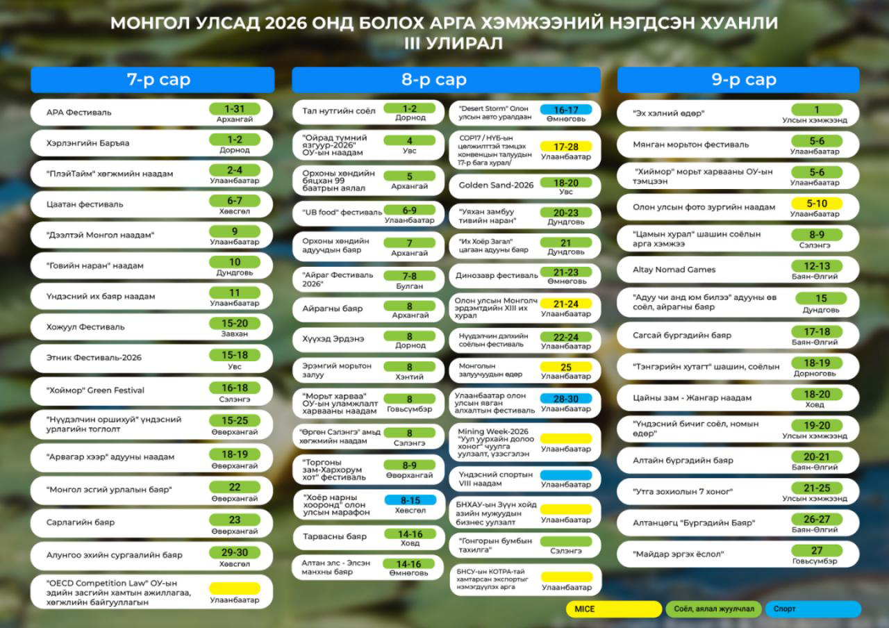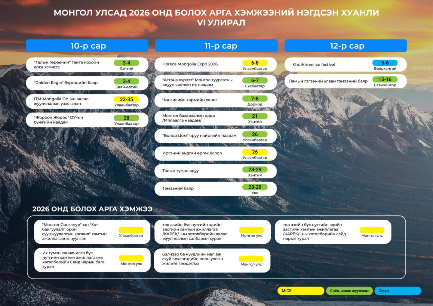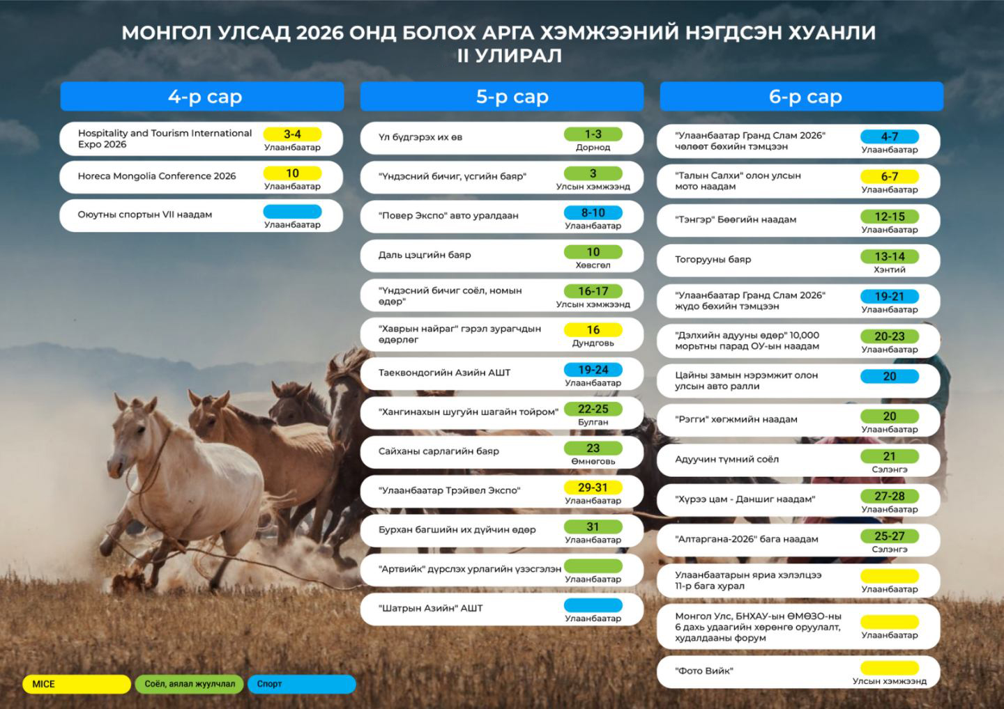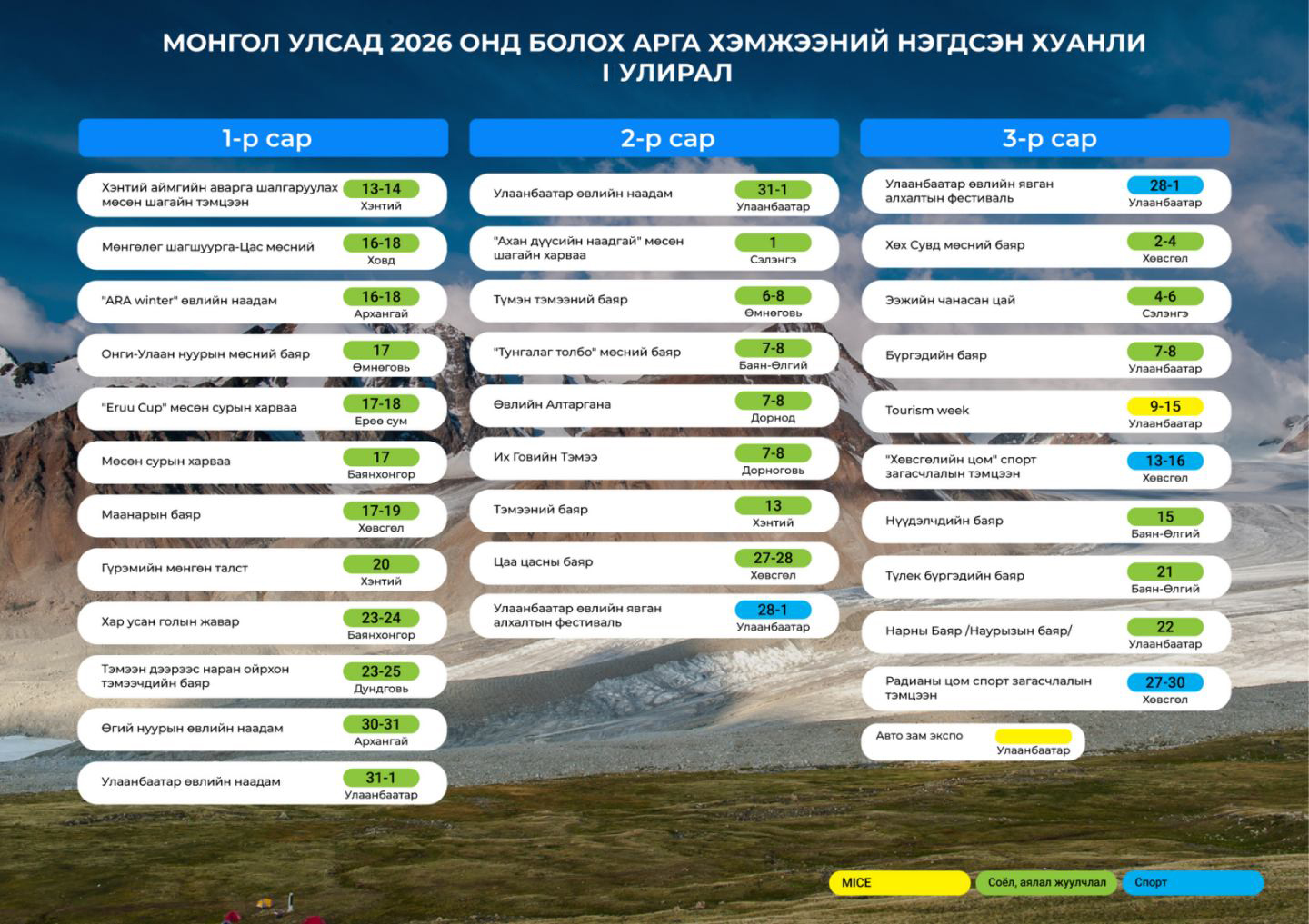 Монгол Улсад 2026 онд соёл, аялал жуулчлал, спортын чиглэлээр зохион байгуулагдах хурал, зөвлөгөөн, үзэсгэлэн арга хэмжээний нэгдсэн цаглаврыг нийслэл, 21 аймаг, төрийн байгууллагууд, мэргэжлийн холбоодын саналыг үндэслэн нэгтгэж, Засгийн газрын 2025 оны 12 дугаар сарын 24-ний өдрийн хуралдаанаар танилцууллаа.