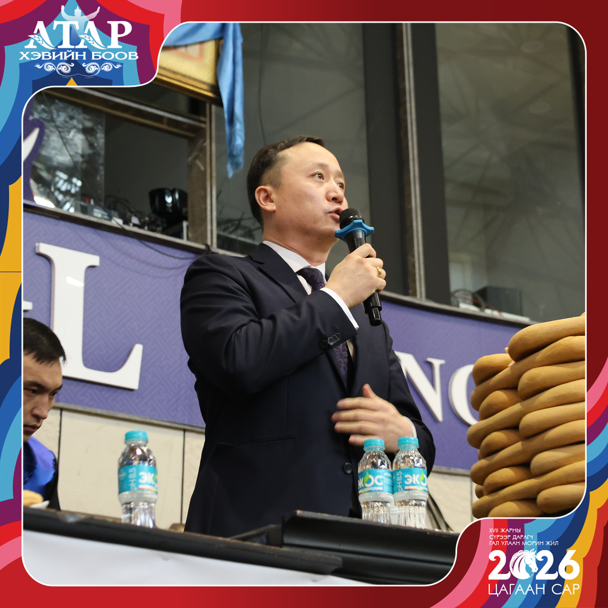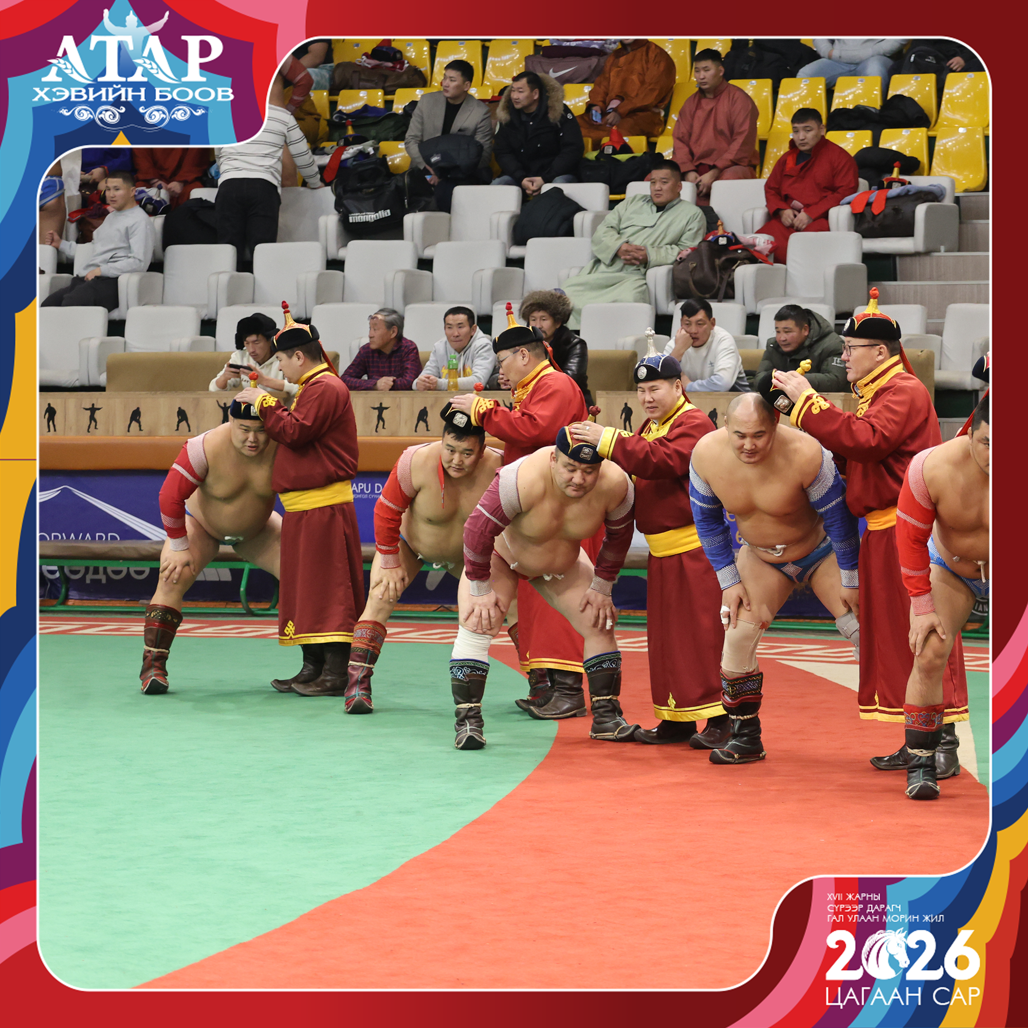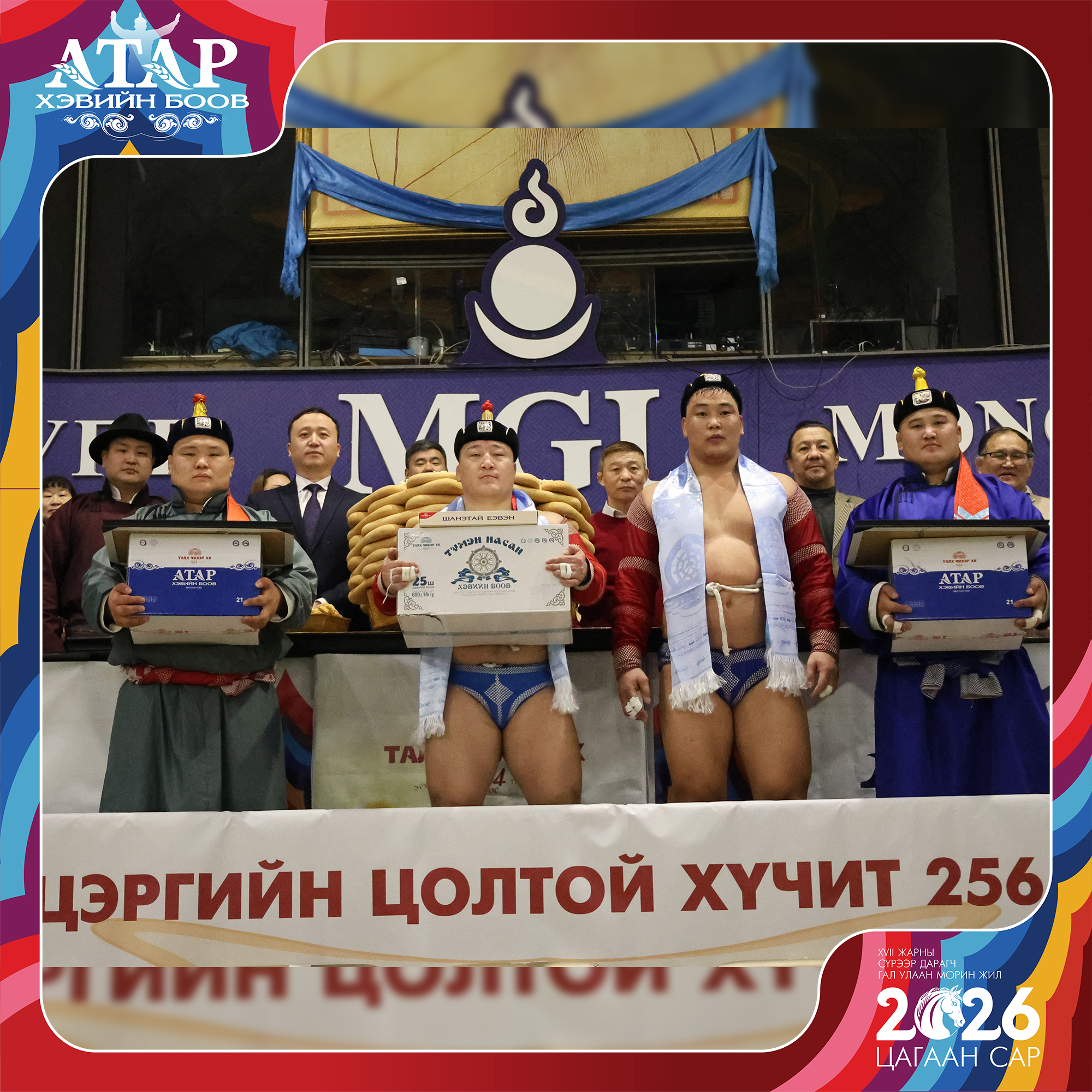 XVII жарны “Сүрээр дарагч” хэмээх гал улаан морин жилийн Сар шинийн баярыг угтан "Талх чихэр” ХК нь “АТАР” хэвийн боовны нэрэмжит аймаг, цэргийн цолтой хүчит 256 бөхийн барилдааныг 1 дүгээр сарын 10-нд буюу өчигдөр Монгол бөхийн өргөөнд зохион байгууллаа. “АТАР” хэвийн боовны нэрэмжит уг барилдаанд аймаг цэргийн цолтой бөхчүүд уран мэхийг уралдуулан, авхаалж самбаа, арга чадлаа сорин барилдаж, түрүүлж, үзүүрлэж байсан бөхчүүдээс Монгол Улсын начин– 12