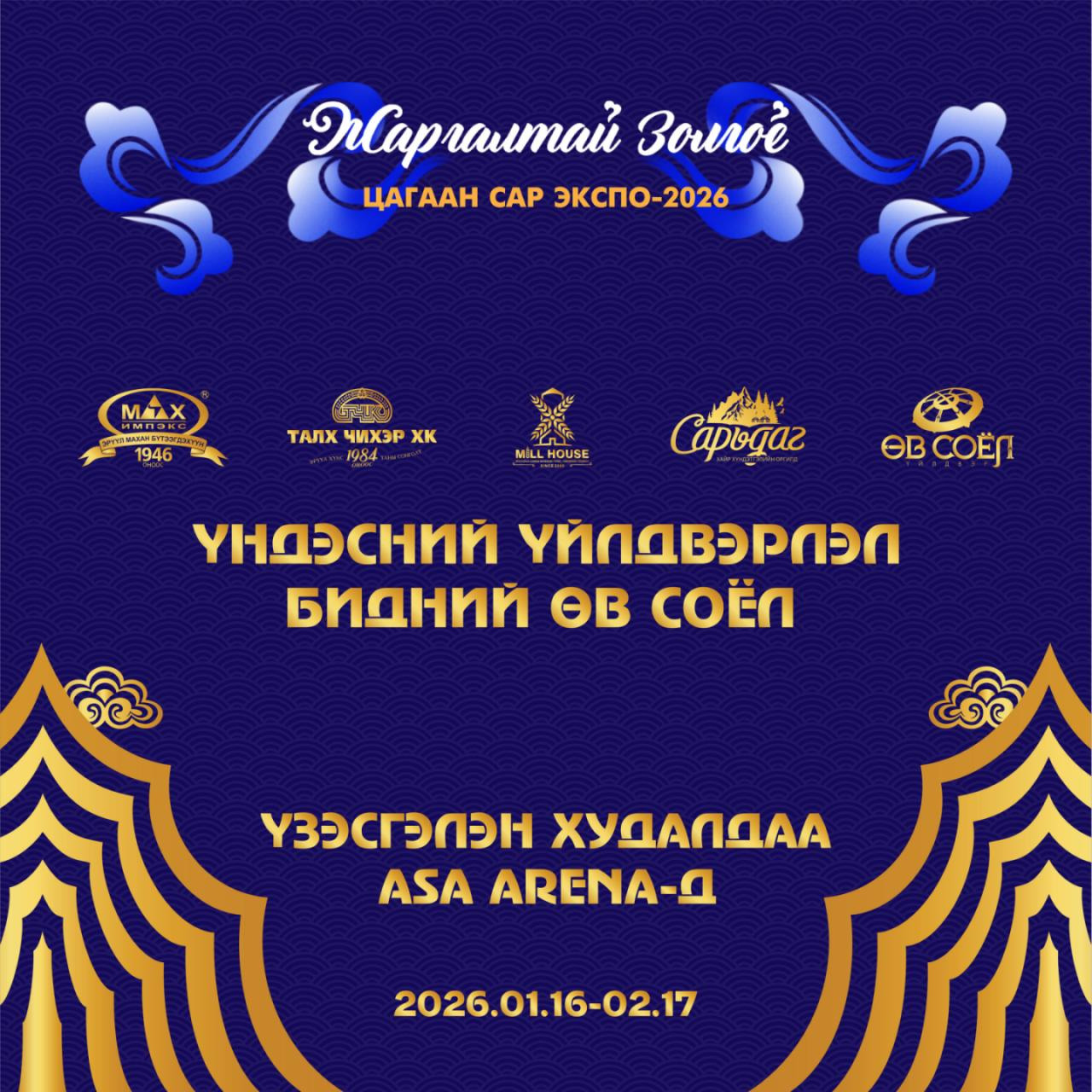 “Жаргалтай золгоё” цагаан сарын үзэсгэлэн худалдаанд “Үндэсний үйлдвэрлэл-Бидний өв соёл” уриан дор Үндэсний үйлдвэрлэгч "Талх Чихэр" ХК, "Мах Импэкс" ХК, "Милл Хаус" ХХК, "Том Бат" ХХК, "Өв Соёл" ХХК нэгдэн оролцоно. Үзэсгэлэн худалдаа “ASA ARENA”-д 2026 оны 1 сарын 16-наас 2 сарын 17-ны өдөр хүртэл өдөр бүр үргэлжилнэ.