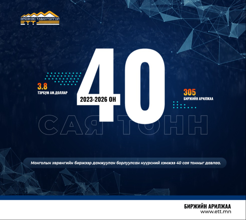МОНГОЛЫН ХӨРӨНГИЙН БИРЖЭЭР ДАМЖУУЛАН БОРЛУУЛСАН НҮҮРСНИЙ ХЭМЖЭЭ 40 САЯ ТОННЫГ ДАВЛАА
