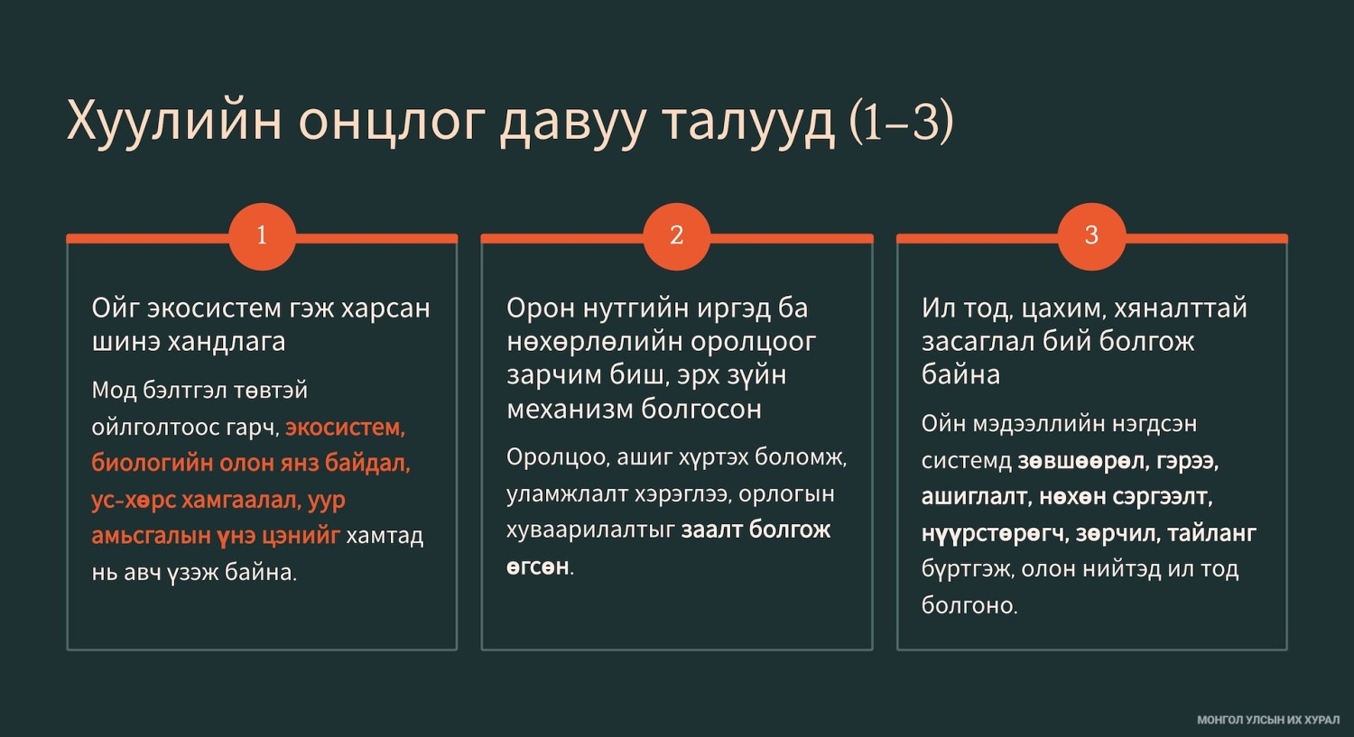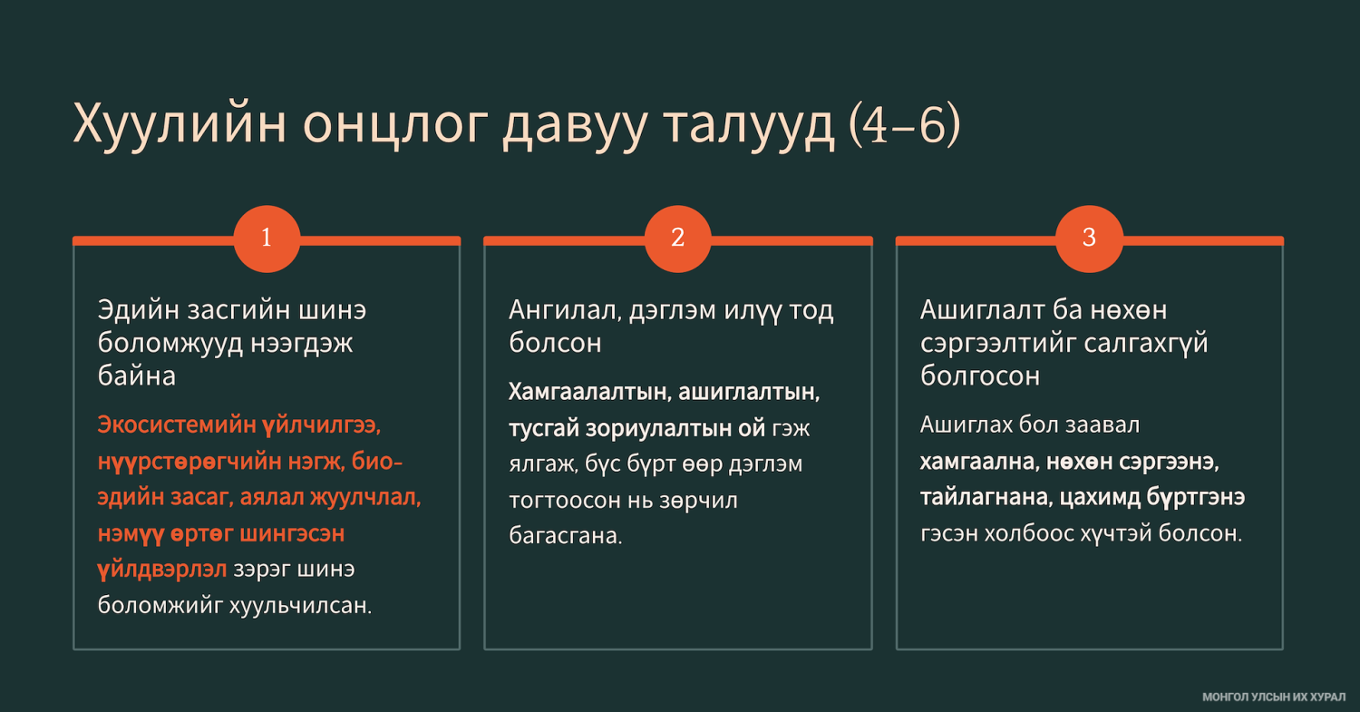 Мөн экосистемийн үйлчилгээ, ойн эдийн засаг, био-эдийн засаг, нүүрстөрөгчийн шингээлт, нүүрстөрөгчийн нэгж, нүүрстөрөгчийн төсөл гэх мэт орчин үеийн зах зээл, уур амьсгалын бодлоготой уялдсан өөрчлөлтүүд туссан хэмээн танилцуулгад дурдсан байлаа. Хуулийн төслийн онцлог, давуу талыг доорх зургаас харна уу.