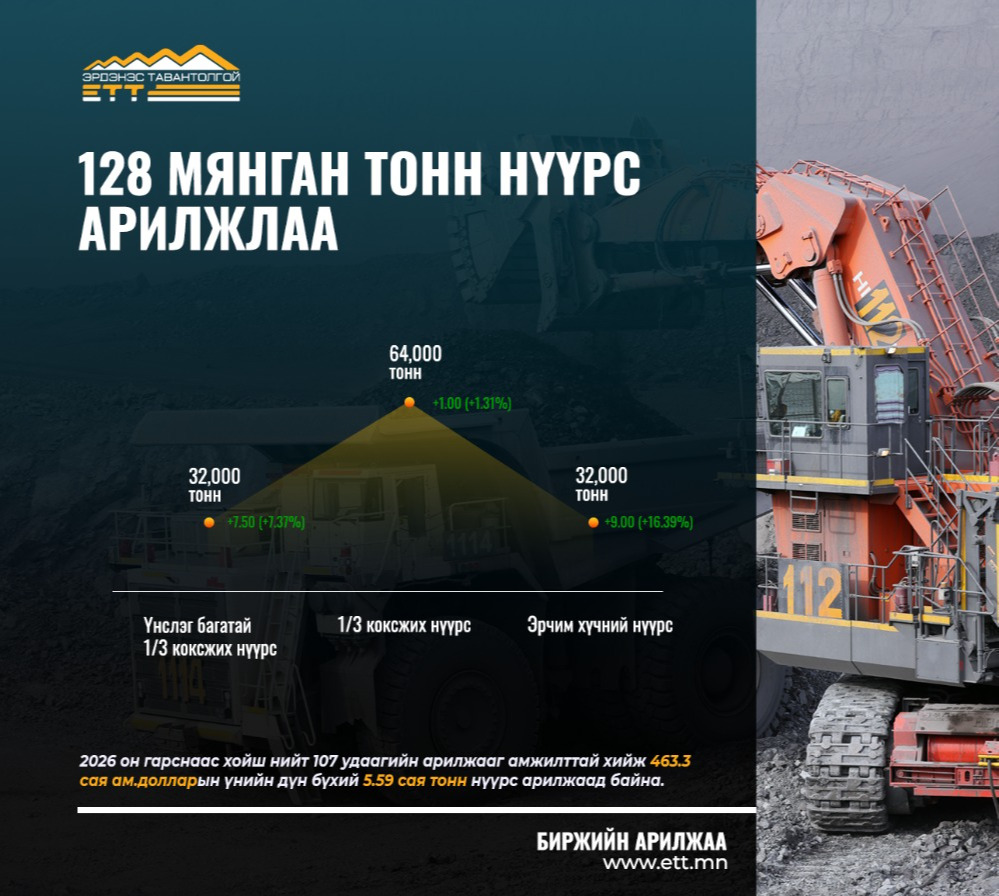 "Эрдэнэс Тавантолгой" ХК 2026 оны 04 дүгээр сарын 16-ны өдөр Монголын Хөрөнгийн Биржээр дамжуулан 3 удаагийн амжилттай арилжаагаар 128.0 мянган тонн нүүрсийг нийт 10.5 сая ам.долларын үнийн дүнтэйгээр БНХАУ-ын боомт хүргэж өгөх нөхцөлөөр арилжааллаа.Үнслэг багатай 1/3 коксжих нүүрс - 32.0 мянган тонн, 109.2 ам.доллароор арилжаалж нийт 3.5 сая ам.долларын үнийн дүнтэйгээр амжилттай хэлцэл хийгдлээ. Арилжаанд 8 оролцогч оролцож үнэ 7.5 ам.доллароор буюу 7.4% өслөө.1/3 коксжих нүүрс - 64.0 мянган тонн, 77.3 ам.доллароор арилжаалж нийт 4.9 сая ам.долларын үнийн дүнтэйгээр амжилттай хэлцэл хийгдлээ. Арилжаанд 3 оролцогч оролцож үнэ 1.0 ам.доллароор буюу 1.3% өслөө.Эрчим хүчний нүүрс - 32.0 мянган тонн, 63.9 ам.доллароор арилжаалж нийт 2.0 сая ам.долларын үнийн дүнтэйгээр амжилттай хэлцэл хийгдлээ. Арилжаанд 6 оролцогч оролцож үнэ 9.0 ам.доллароор буюу 16.4% өслөө.2026 онд 107 удаагийн арилжаагаар 463.3 сая ам.долларын үнийн дүн бүхий 5.59 сая тонн нүүрс арилжлаа.