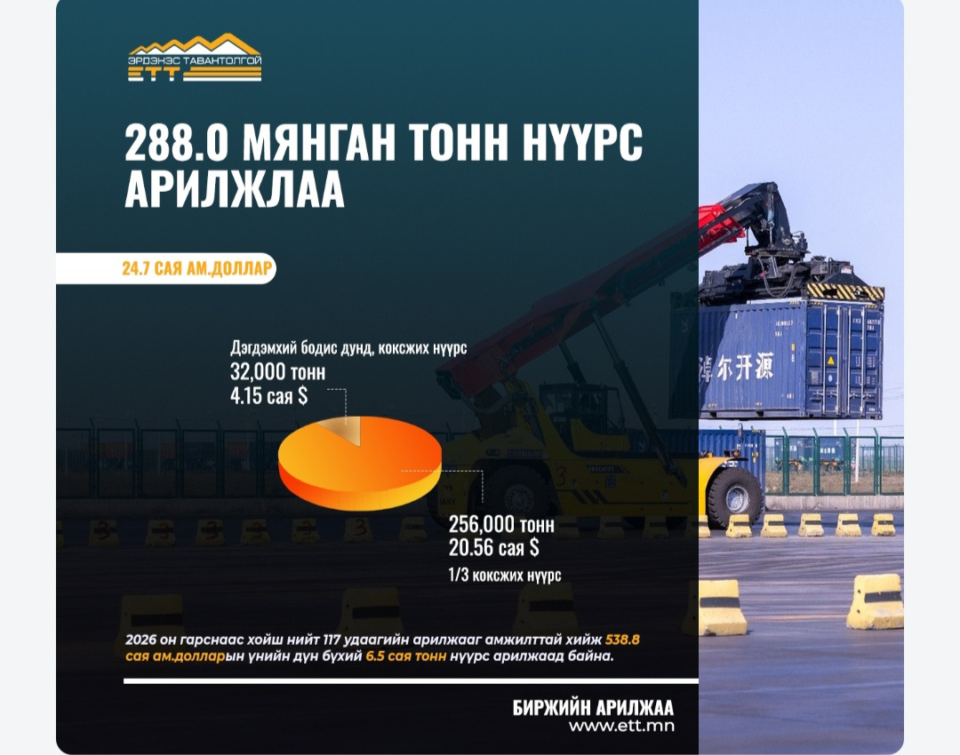 "Эрдэнэс Тавантолгой" ХК 2026 оны 4 дүгээр сарын 22-ны өдөр Монголын хөрөнгийн биржээр дамжуулан хоёр удаагийн амжилттай арилжаа хийлээ. Энэхүү арилжаагаар нийт 288.0 мянган тонн нүүрсийг 24.7 сая ам.доллароор, БНХАУ-ын боомтод хүргэж өгөх нөхцөлөөр борлуулав.Дэгдэмхий бодис дунд, коксжих нүүрс- 32.0 мянган тонн, 129.7 ам.доллароор арилжаалж нийт 4.15 сая ам.долларын үнийн дүнтэйгээр амжилттай хэлцэл хийгдлээ1/3 коксжих нүүрс үнс - 256.0 мянган тонн, 80.3 ам.доллароор арилжаалж нийт 20.56 сая ам.долларын үнийн дүнтэйгээр амжилттай хэлцэл хийгдлээ. Арилжаанд 4.0 оролцогч оролцож үнэ 4.0 ам.доллароор буюу 5.2% өслөө.2026 он гарснаас хойш тус компани нийт 117 удаагийн арилжаагаар 538.8 сая ам.долларын үнийн дүн бүхий 6.5 сая тонн нүүрс борлуулаад байна.