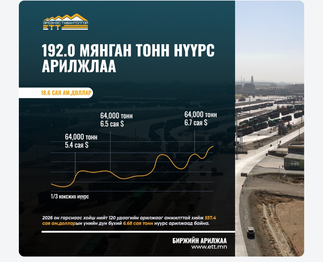 "Эрдэнэс Тавантолгой" ХК 2026 оны 04 дүгээр сарын 23-ны өдөр Монголын Хөрөнгийн Биржээр дамжуулан 3 удаагийн амжилттай арилжаагаар 192.0 мянган тонн нүүрсийг нийт 18.6 сая ам.долларын үнийн дүнтэйгээр БНХАУ-ын боомт хүргэж өгөх нөхцөлөөр арилжааллаа.1/3 коксжих нүүрс - 64.0 мянган тонн, 101.4 ам.доллароор арилжаалж нийт 6.5 сая ам.долларын үнийн дүнтэйгээр амжилттай хэлцэл хийгдлээ. Арилжаанд 9 оролцогч оролцож үнэ 20.0 ам.доллароор буюу 24.6% өслөө.1/3 коксжих нүүрс - 64.0 мянган тонн, 105.0 ам.доллароор арилжаалж нийт 6.7 сая ам.долларын үнийн дүнтэйгээр амжилттай хэлцэл хийгдлээ. Арилжаанд 4 оролцогч оролцож үнэ 19.0 ам.доллароор буюу 22.1% өслөө.1/3 коксжих нүүрс - 64.0 мянган тонн, 84.3 ам.доллароор арилжаалж нийт 5.4 сая ам.долларын үнийн дүнтэйгээр амжилттай хэлцэл хийгдлээ. Арилжаанд 6 оролцогч оролцож үнэ 8.0 ам.доллароор буюу 10.5% өслөө.2026 онд *120 удаагийн арилжаагаар* 557.4 сая ам.долларын үнийн дүн бүхий 6.68 сая тонн нүүрс арилжлаа.