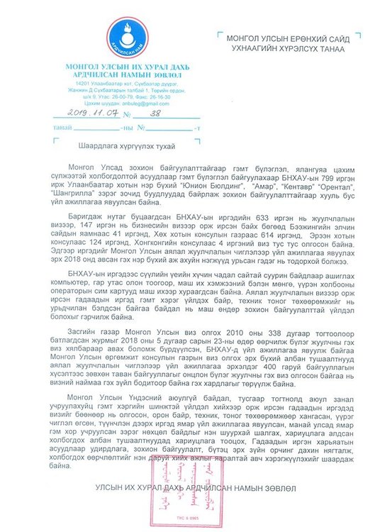 Монгол Улсад зохион байгуулалттайгаар цахим сүлжээтэй холбогдолтой асуудлаар гэмт бүлэглэл байгуулахаар БНХАУ-ын 799 иргэн Улаанбаатар хотын нэр бүхий зочид буудлуудад байрлаж, зохион байгуулалттайгаар хууль бус үйл ажиллагаа явуулсан байна.