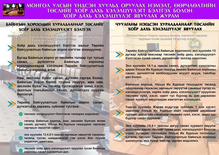 Улсын Их Хурлын Төрийн байгуулалтын байнгын хороо Улсын Их Хурлаар хэлэлцэж байгаа Монгол Улсын Үндсэн хуульд оруулах нэмэлт, өөрчлөлтийн төслийн хоёр дахь хэлэлцүүлгийг ирэх долоо хоногт үргэлжлүүлэн хийж, энэ талаарх санал, дүгнэлт, зарчмын зөрүүтэй саналын томьёоллоо чуулганы нэгдсэн хуралдаанд оруулж хэлэлцүүлнэ.