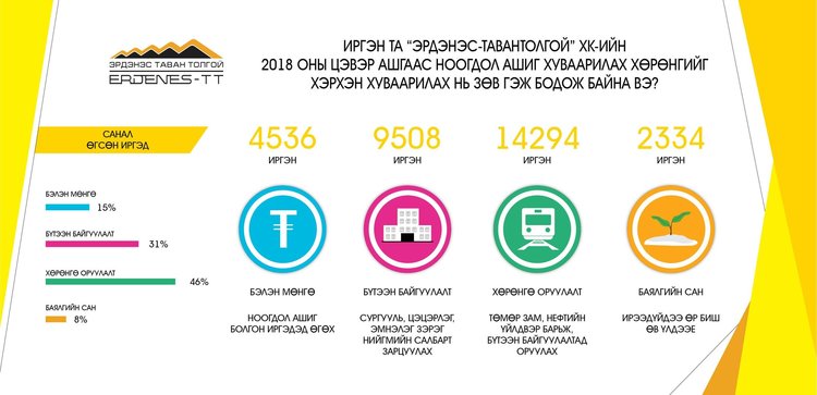"Эрдэнэс-Тавантолгой” ХК-ийн 1072 хувьцааны ноогдол ашгийг бэлэн мөнгө хэлбэрээр өгөх үү эсвэл эдийн засагт тэргүүлэх чиглэлийн томоохон төслүүдэд хөрөнгө оруулалт хэлбэрээр хандивлах уу гэдэг дээр иргэдийн байр суурь харилцан адилгүй байна.