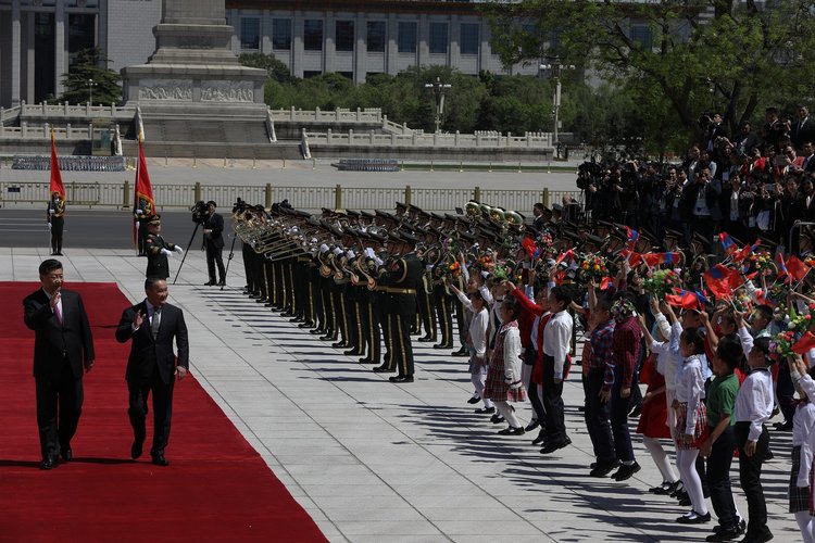 Төрийн тэргүүнийг Ардын Их хурлын талбайд хүрэлцэн ирмэгц БНХАУ-ын дарга Ши Жиньпин угтан мэндчилж БНХАУ-ын талаас угтах ёслолд оролцож буй өндөр, дээд албан тушаалтнуудыг танилцуулав.