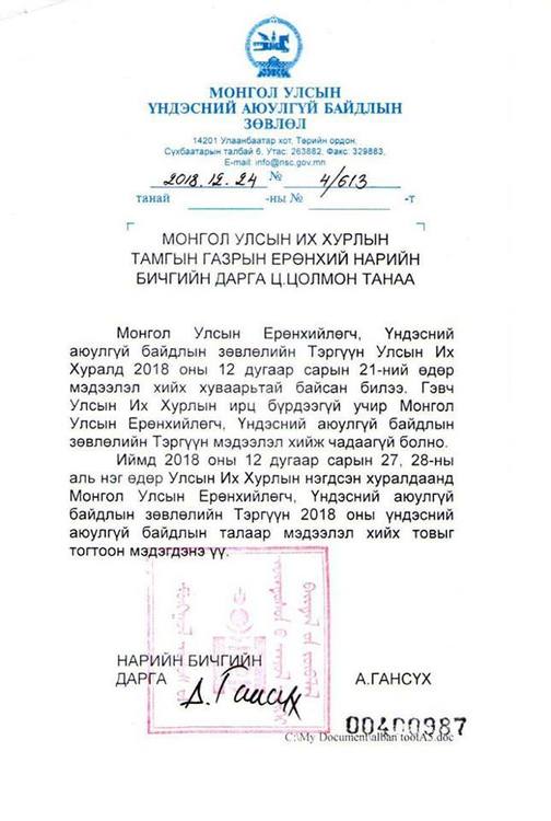 Монгол Улсын Ерөнхийлөгч, Үндэсний аюулгүй байдлын зөвлөлийн тэргүүн Улсын Их Хурлын 2018 оны 12 дугаар сарын 21-ний өдрийн чуулганы нэгдсэн хуралдаанд улс орны үндэсний аюулгүй байдлын талаар мэдээлэл хийх хуваарьтай байсан ч гишүүдийн ирц бүрдээгүйн улмаас мэдээлэл хойшлогдсон.