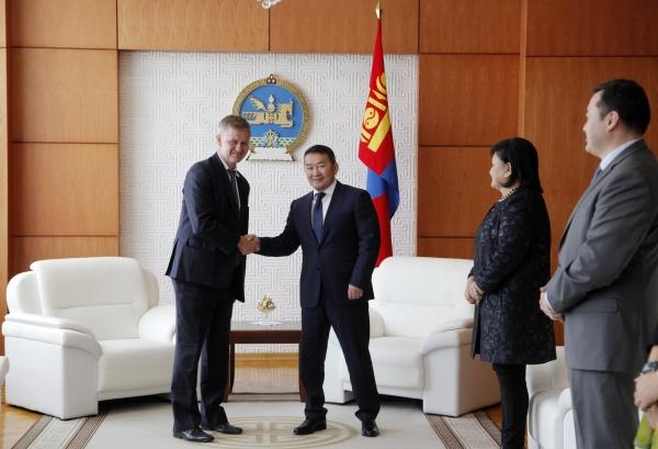 Монгол Улсын Ерөнхийлөгч Х.Баттулга Монгол Улсад албан ёсны айлчлал хийж байгаа НҮБ-ын Байгаль орчны хөтөлбөрийн гүйцэтгэх захирал Эрик Солхейм болон Монгол дахь суурин төлөөлөгч Б Транкман нарын төлөөлөгчдийг өнөөдөр хүлээн авч уулзлаа.
