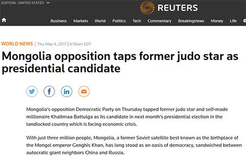 Эдийн засаг нь хямарсан далайд гарцгүй орон болох Монголын сөрөг хүчин Ардчилсан нам ирэх сард болох Ерөнхийлөгчийн сонгуульд Халтмаагийн Баттулгыг нэр дэвшүүллээ. Баттулга нь жудо бөхийн од байсан бөгөөд өөрийн хүчээр саятан болсон нэгэн.