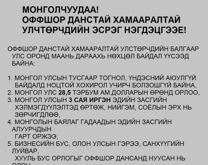 Мөн манай гаригийн 12 оффшор бүсэд Монголын 611 компани бүртгэлтэй байна. 272 компани нь Их Британы арлуудад, 193 компани Хонг Конгод, 68 компани Швейцарьт, бусад нь Люксенбург, Вагама, Кипр, Гаутены арлуудад, Панама, Ирланд, Гибралтар, Летхейнштенд бүртгэлтэй байгаа гэж энэ байгууллага зарласан юм.