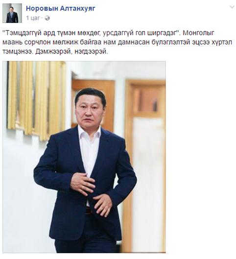 Монгол Улсын Ерөнхий сайд асан Норовын Алтанхуяг тун саяхан өөрийн албан ёсны фэйсбүүк хуудсандаа ””Тэмцдэггүй ард түмэн мөхдөг, урсдаггүй гол ширгэдэг”. Монголыг маань сорчлон мөлжиж байгаа нам дамнасан бүлэглэлтэй эцсээ хүртэл тэмцэнээ. Дэмжээрэй, нэгдээрэй.” хэмээн нийтэлжээ. Одоогоор