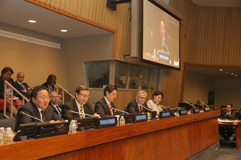 НҮБ-ын “Тогтвортой хөгжлийн зорилтуудад хүрэхийн тулд хамтран ажиллах уриа: Өөрчлөлтийг түргэсгэхэд нэгдмэл шийдэлд хүрэх нь” сэдэвт салбар хуралдаан өнөөдөр боллоо. НҮБ-ын Байгаль орчны хөтөлбөрөөс зохион байгуулсан сайд нарын түвшний арга хэмжээг НҮБ-ын Байгаль орчны Ассамблейн Ерөнхийлөгч С.Оюун нээсний дараа нь Монгол Улсын Ерөнхийлөгч Цахиагийн Элбэгдорж хэлсэн үгэндээ: